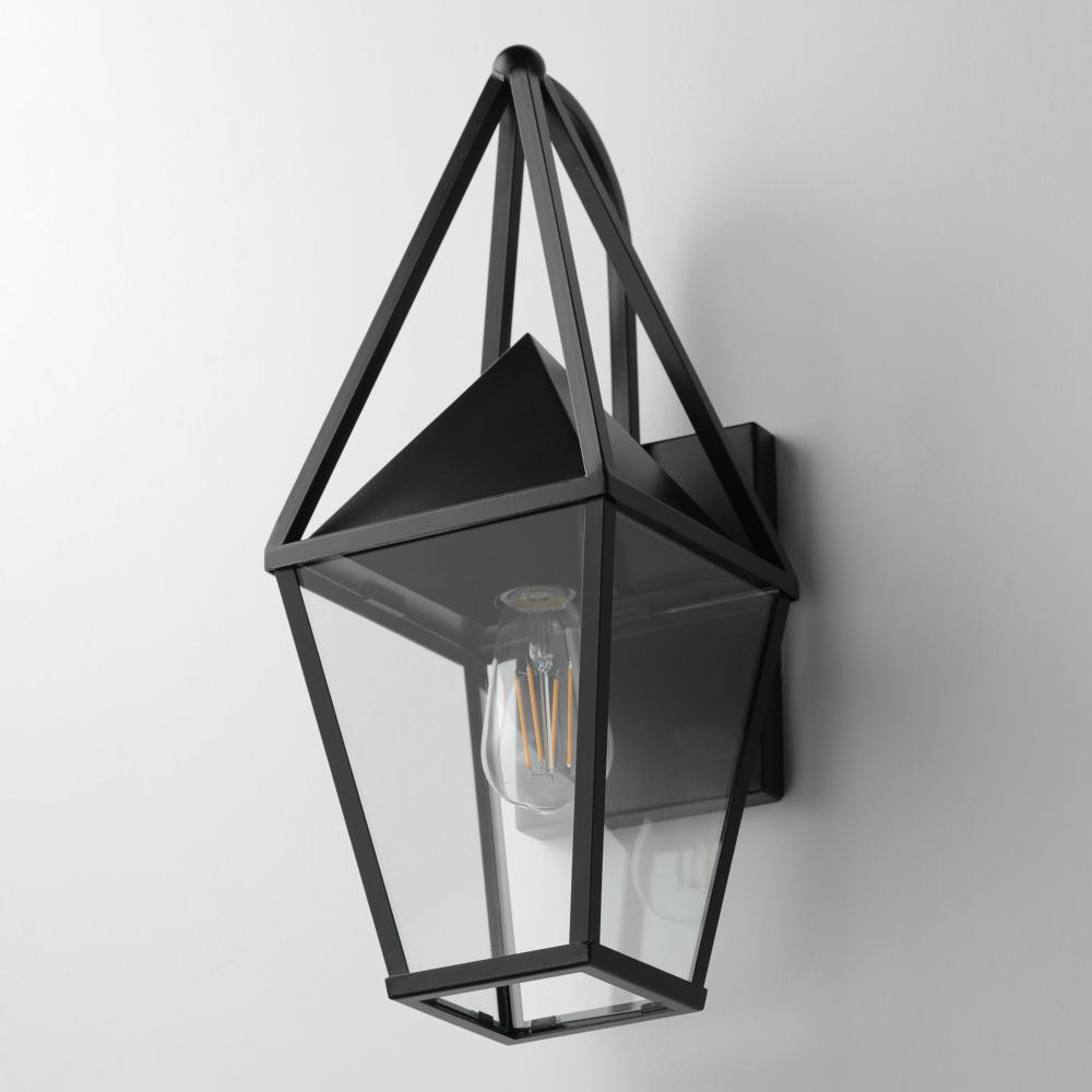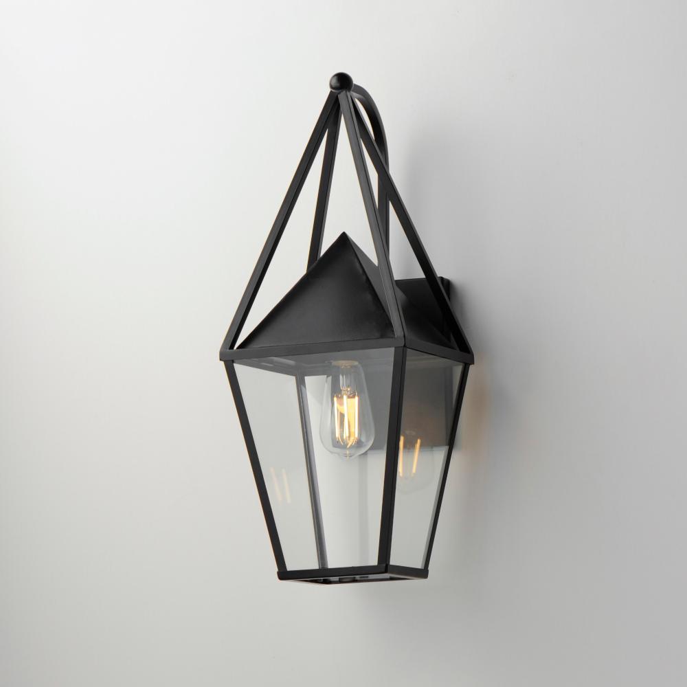 An exaggerated openwork framed steeple adds vertical qualities on a sharp-lined Matte Black lantern frame. Blending modern concepts with forms that evoke a whimsical imagery, this collection presents a transitional styling for outdoor spaces.