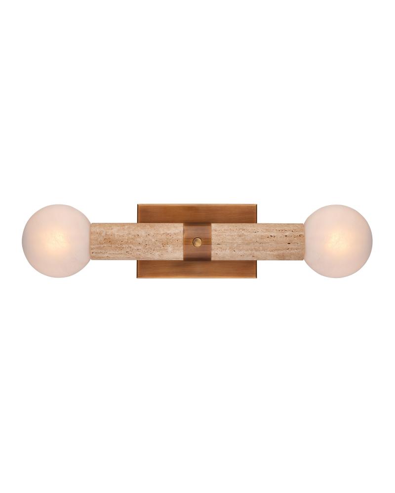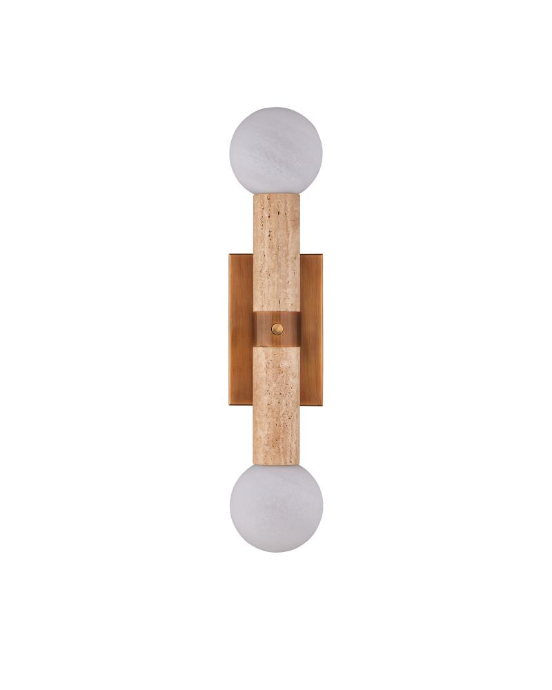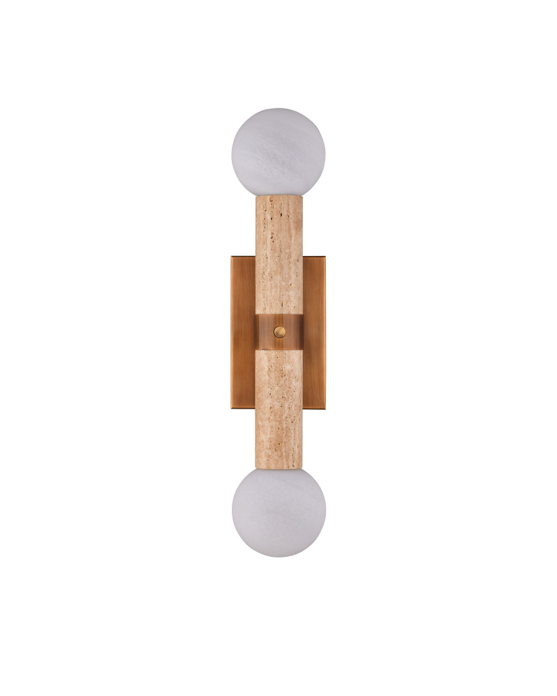 The Beatrix Beige Bath Wall Sconce features a center column made of natural travertine that extends beyond each end of the wall-plate to hold globes made of textured art glass. The milky, mottled glass draws out the pale veins in the travertine, while the antique brass finish on the metal brings warmth to the fixture. This wall sconce can be mounted horizontally or vertically, and the natural stone will vary from fixture to fixture.
