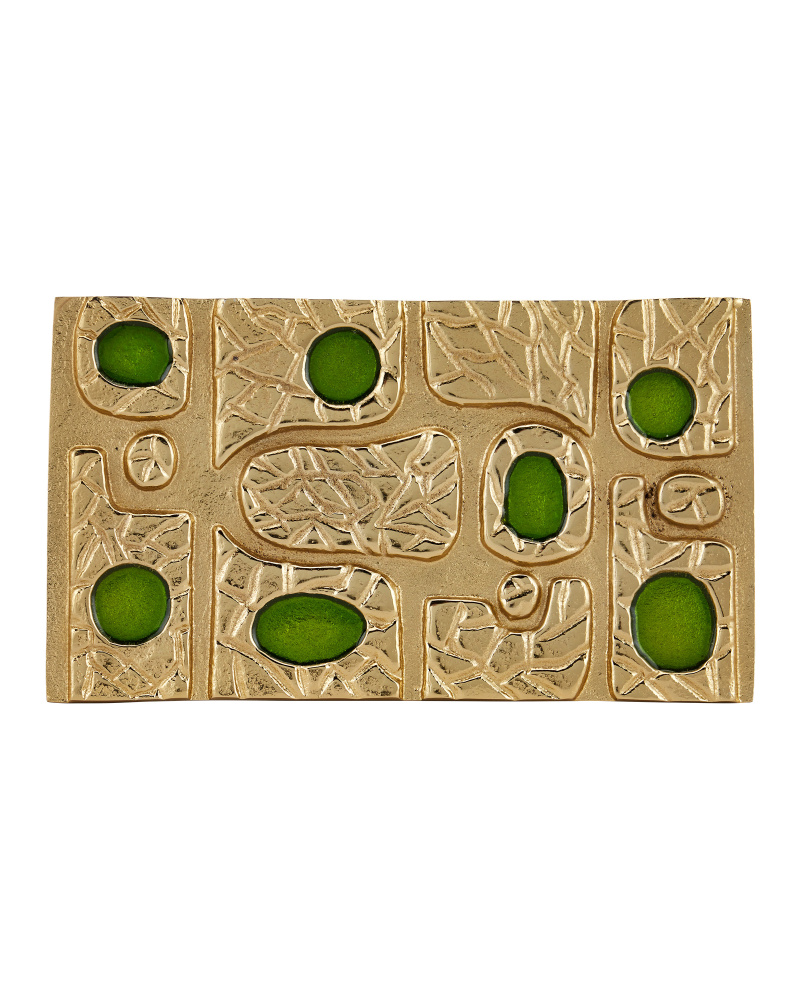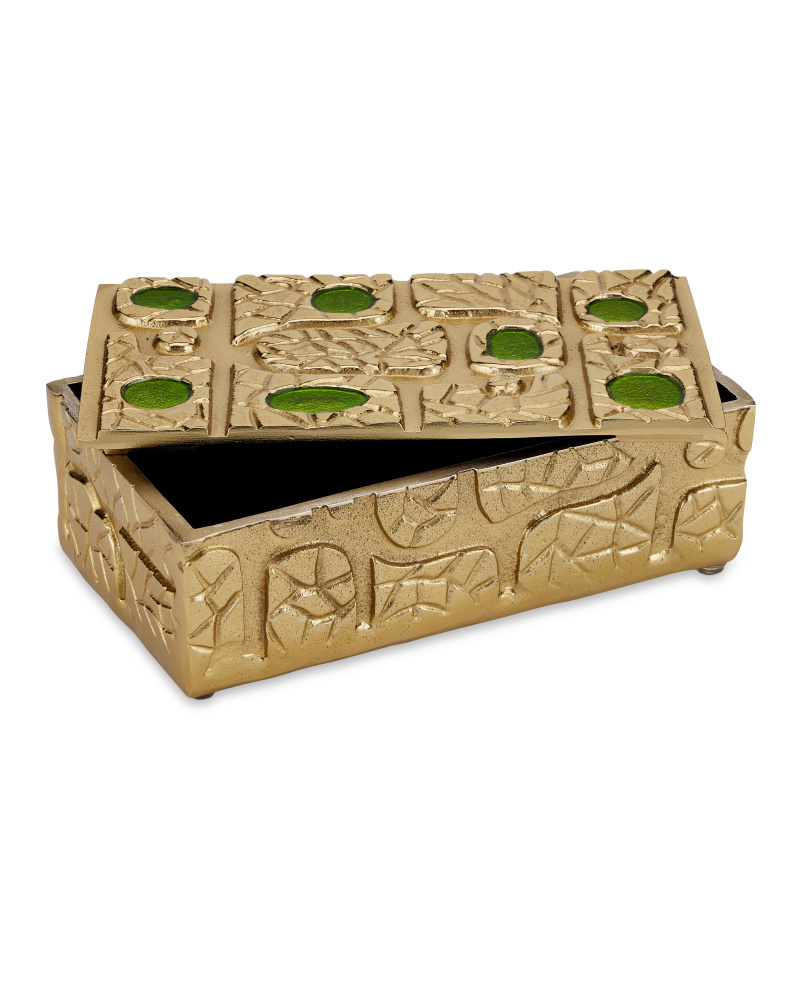 Inspired by a 1940s design, the Beau Monde Gold & Green Box has textural shapes made of cast aluminum in a gold finish, ornamented with green enamel lozenges fitted in place to create a lively pattern running along its surfaces. Inspired by a piece seen at a French flea market, the gold decorative box is lined in black fabric. for dry use only.