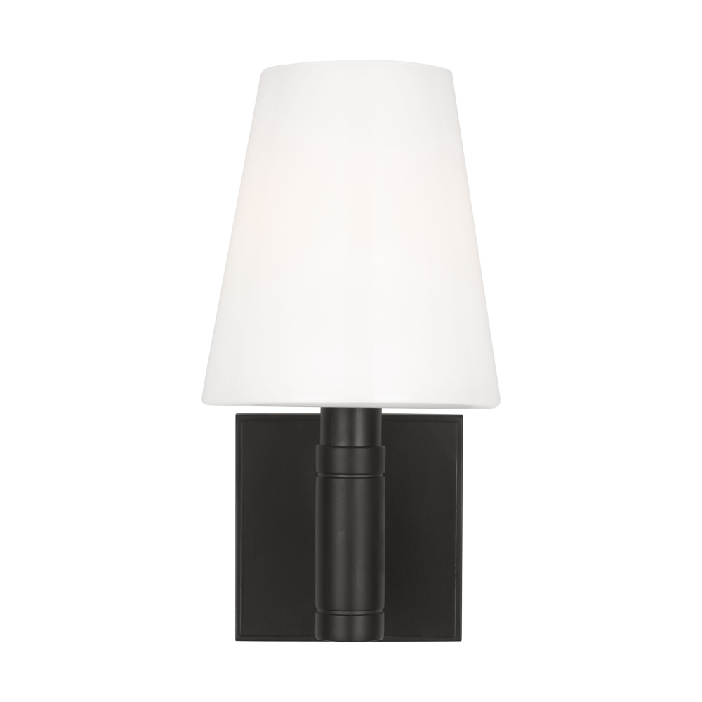The Beckham Classic one light wall sconce in aged iron offers shadow-free lighting in your powder room, spa, or master bath room. Traditional silhouette with modern barrel detail on both the central hub and socket