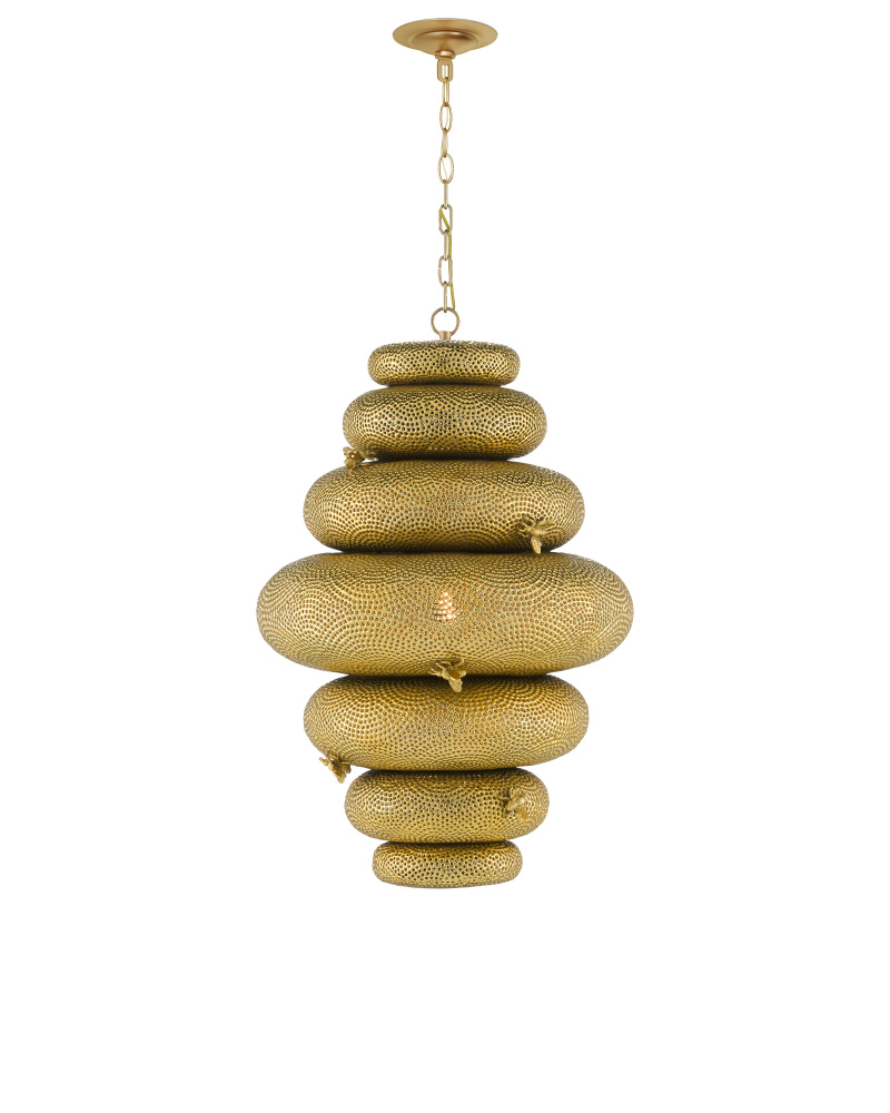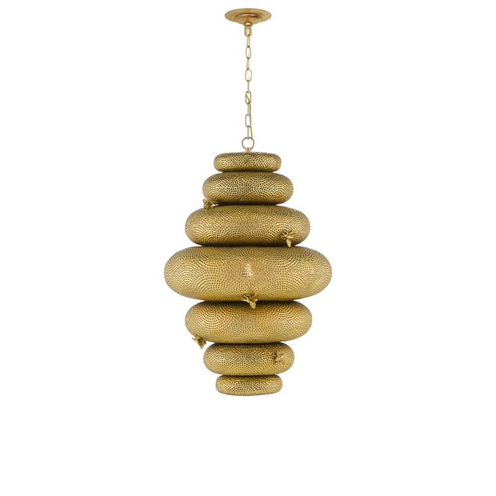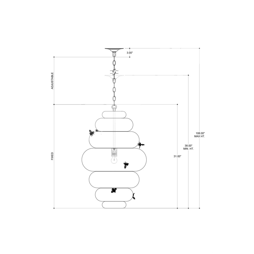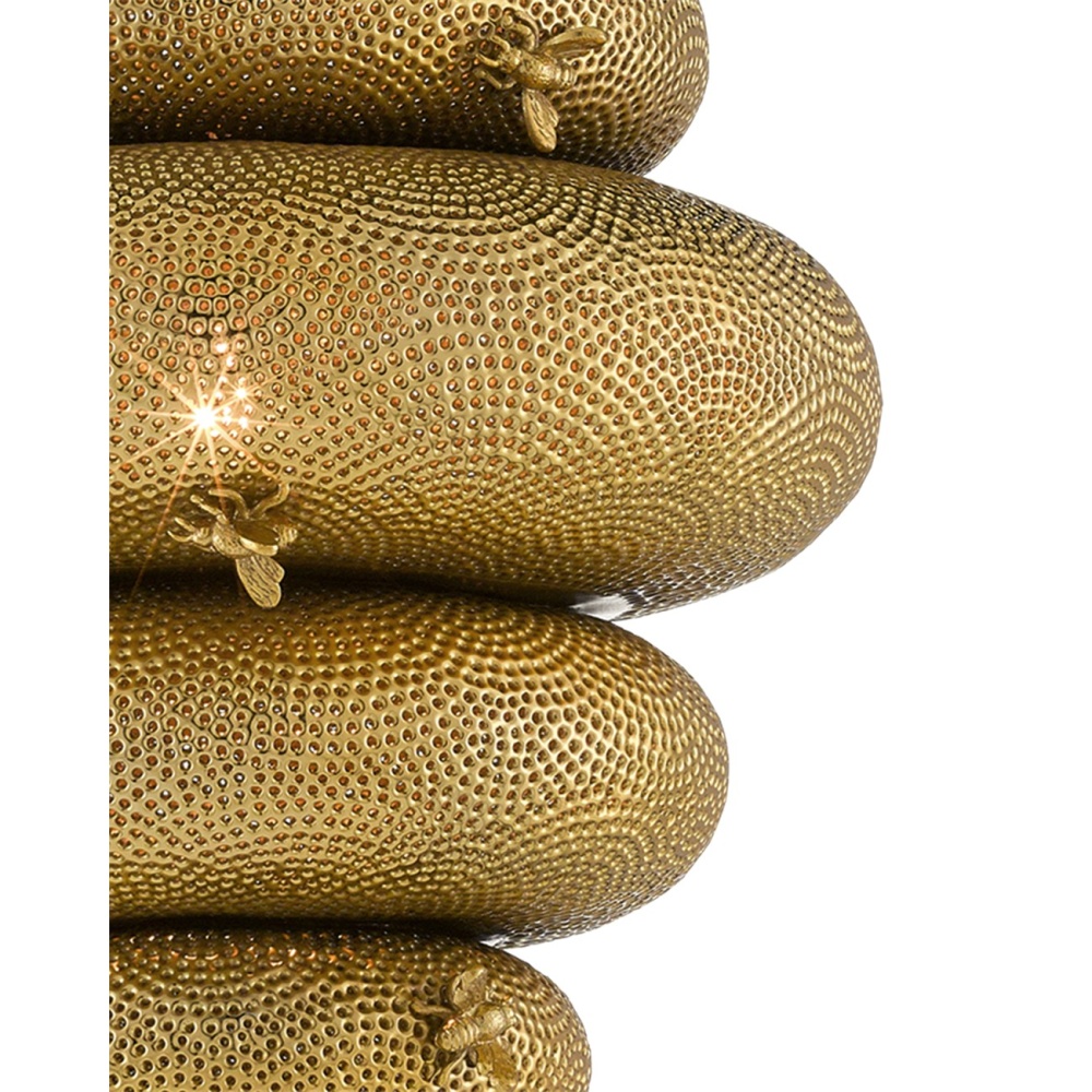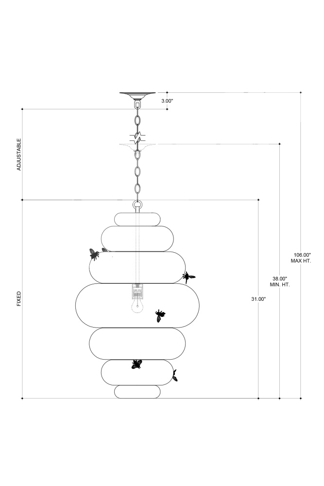 The Bee My Honey Chandelier, designed by Sasha Bikoff, is guaranteed to be a playful element in an interior. Made of wrought iron in an antique brass finish, the gold chandelier is handmade using a technique called metal piercing, a process during which composite is poured into the cavity of a mold and intricately pierced using a nail-shaped piece of metal. The textural stippling creates the feeling of a hive around which cast bees have been welded. Adjustable from 38" to 106" with use of included chain/rod kit/cable. If your space calls for a longer drop, additional chain/rods/cable is available for purchase.