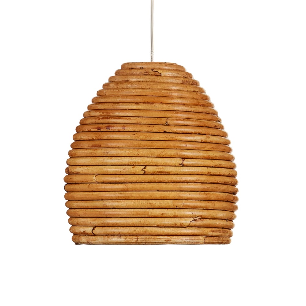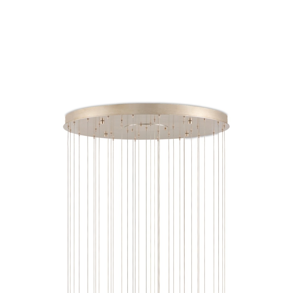 The Beehive 36-Light Multi-Drop Pendant has rattan bell-shaped shades. Because the natural material is not perfectly uniform, there are fissures in the shades that allow illumination to escape to create a warm glow. The canopy of this piece is luminous in a painted silver finish. This fixture is among Currey & Company's multi-drop pendant collection, which includes multiple configurations.