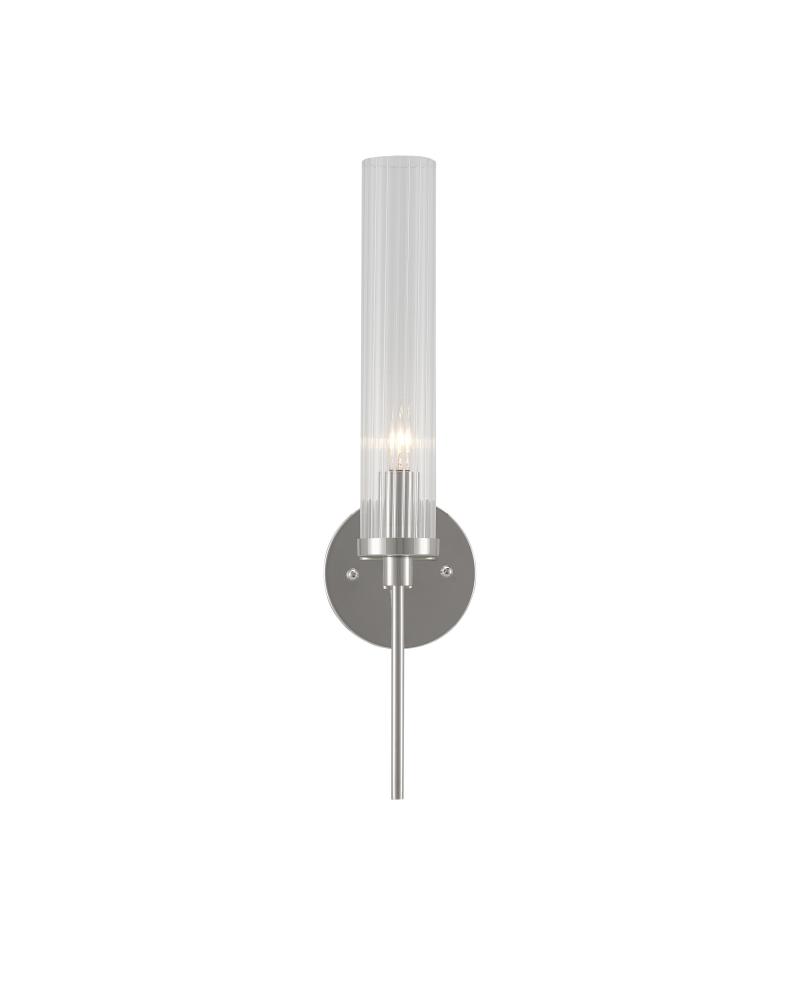 Slender in style, the Bellings Nickel Wall Sconce has a pencil thin body and tall striated glass canister shade. Made of metal in a polished nickel finish, the silver wall sconce is the very definition of simplicity but with a sophisticated complexity to its design. Part of the Bagno Collection of wall sconces designed for bathroom spaces.
