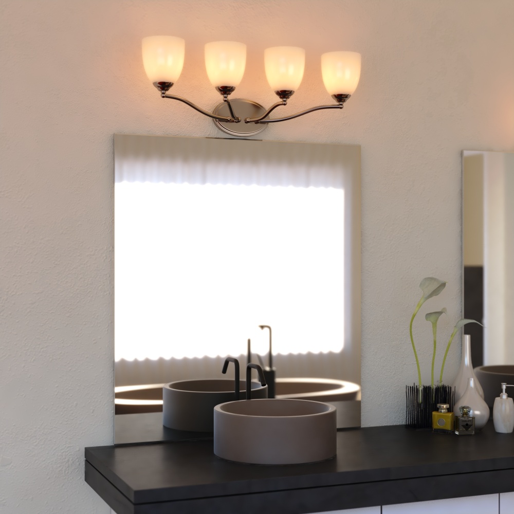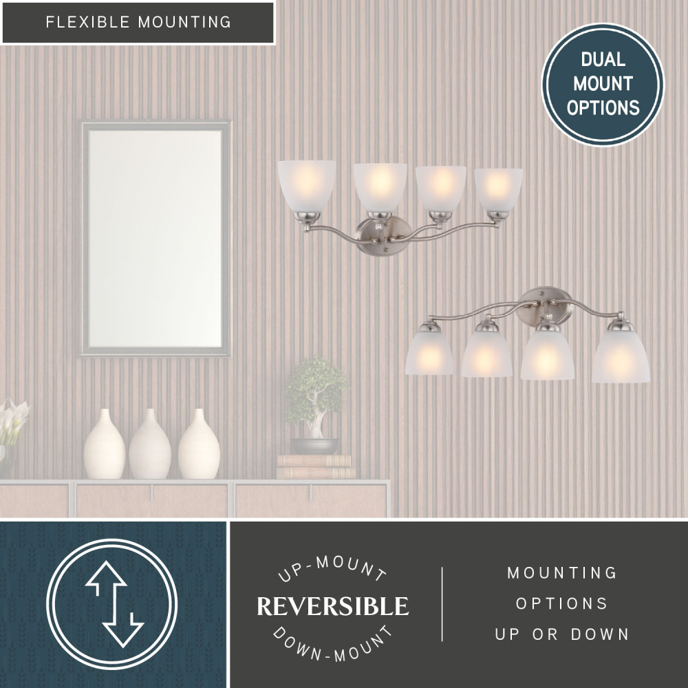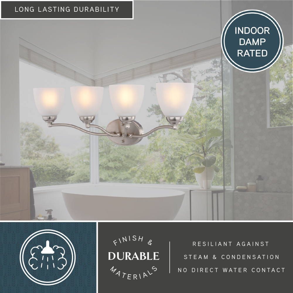 Transform your bathroom's ambiance with the Bellwood 4-light vanity, a perfect blend of classic design and modern sophistication. The satin nickel finish provides a timeless feel, while the frosted glass shades add a touch of vintage charm, diffusing a warm, inviting light. This wall light reimagines traditional style with thoughtfully updated details, including classic sphere accents and graceful tulip glass shades. Damp-rated for lasting performance, the Bellwood vanity is designed to withstand the moisture of bathroom environments. Enhance your daily routine with a fixture that seamlessly bridges traditional charm and modern functionality.