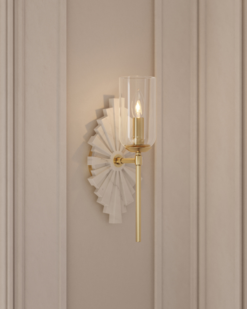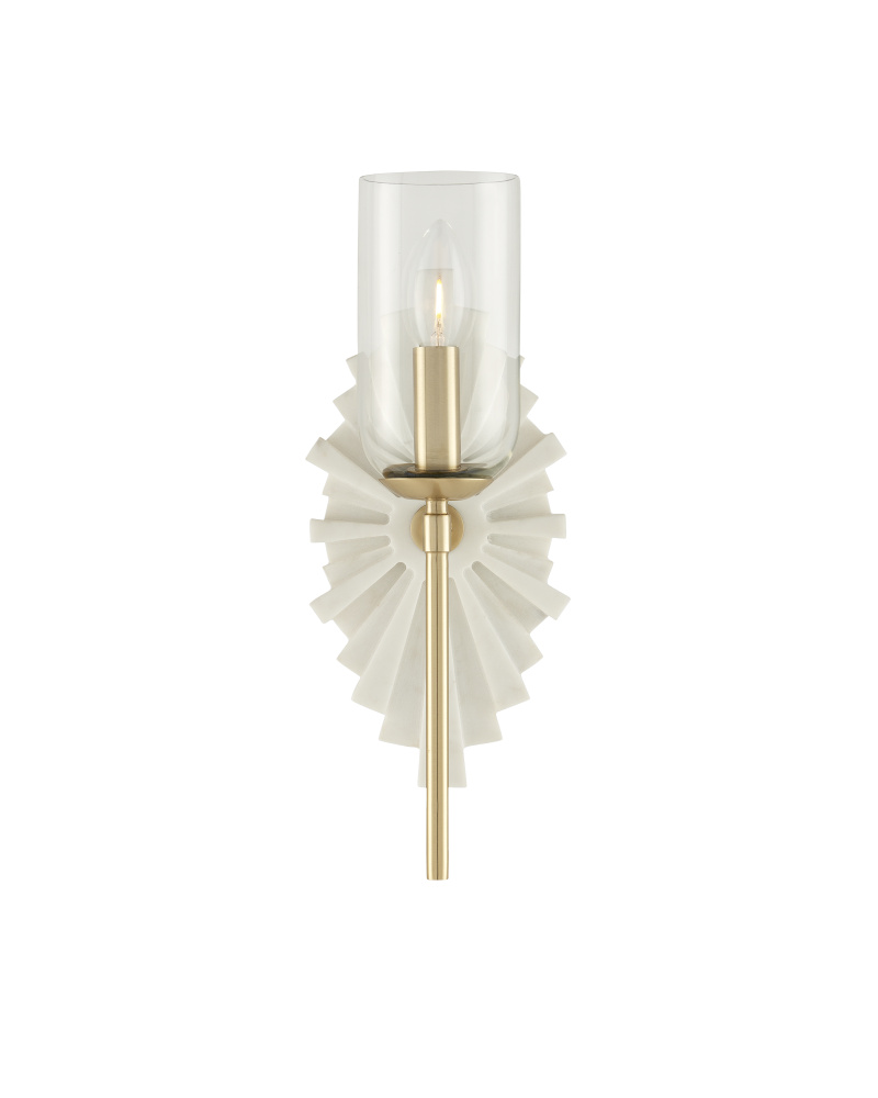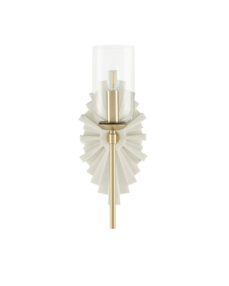 The Benthos White Wall Sconce features a starburst pattern on its wall plate, crafted from marble. The brass finish on the metal adds warmth to the design and contrasts beautifully with the crisp, pale marble. This wall sconce is part of the Bagno Collection of damp-rated lighting, specifically designed for bathrooms. Due to the natural variations in marble, each sconce will have unique characteristics.