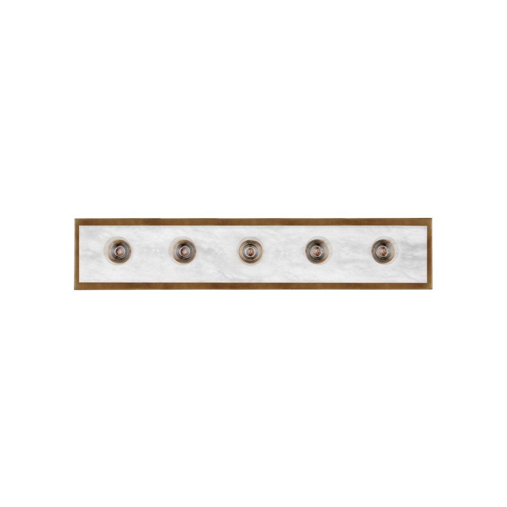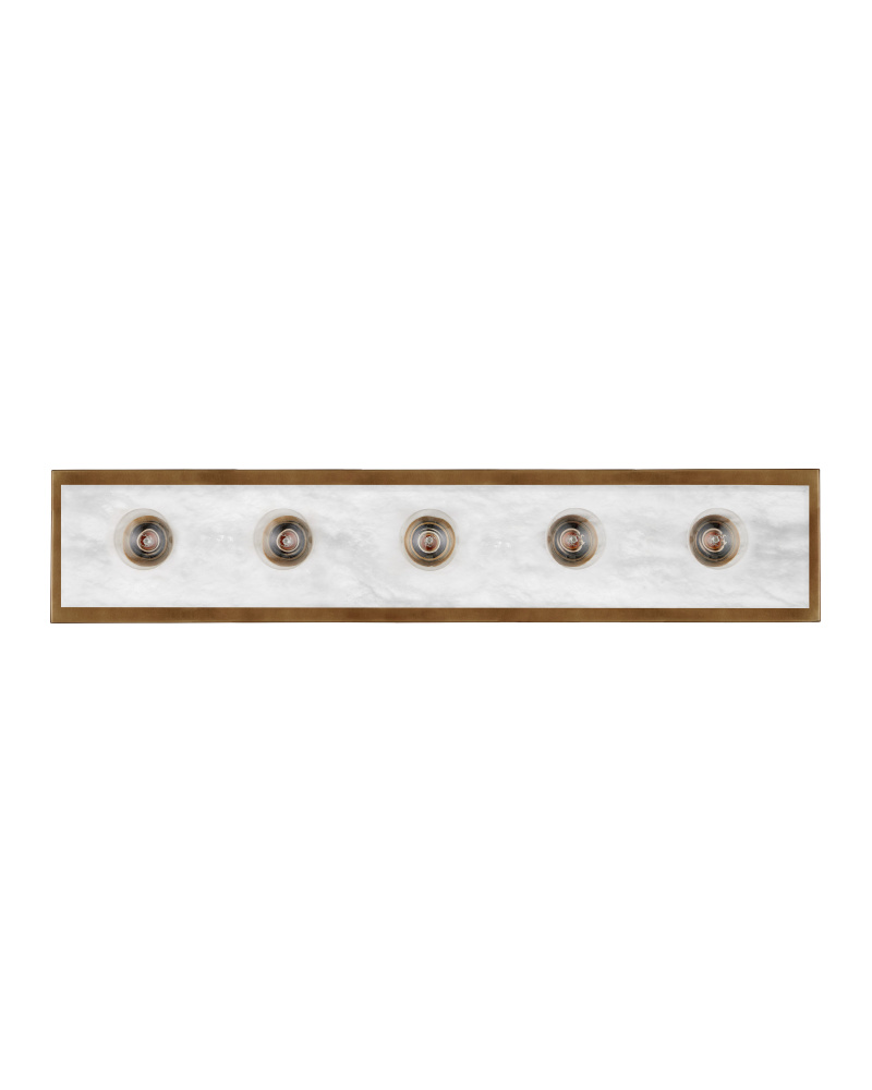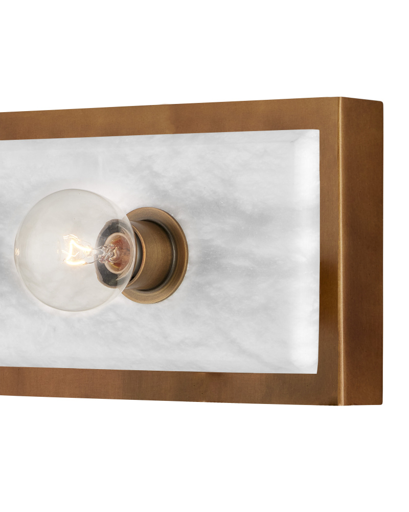 The Berdine Large Brass Bath Bar is a simple design that allows the natural alabaster to shine. Made of metal in an antique brass finish, the warmth of the gold contrasts the coolness of the stone to bring a subtle complexity to this design. It can be mounted vertically or horizontally, and the alabaster panel has a nice bevel to it where it meets the metal rim.
