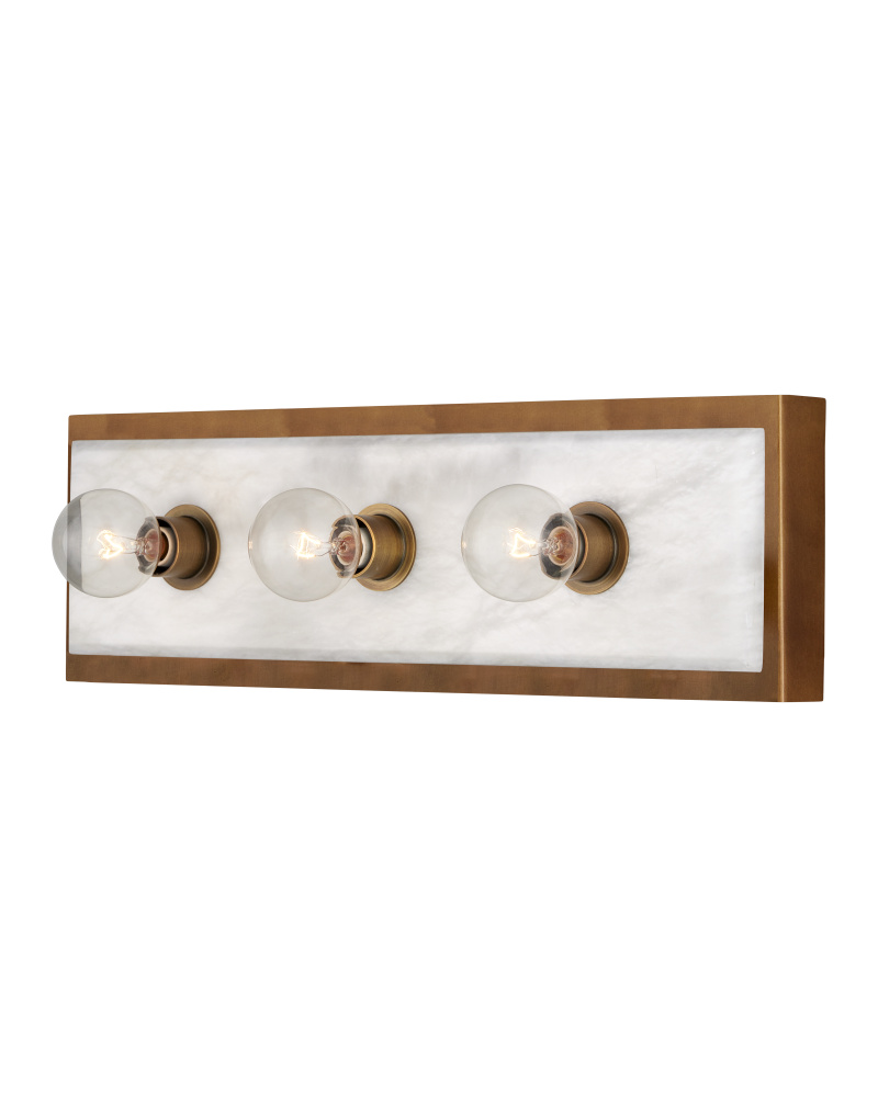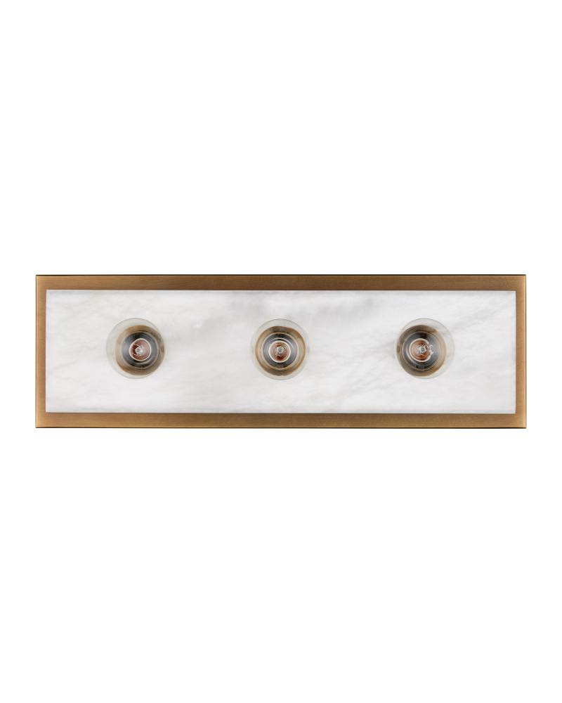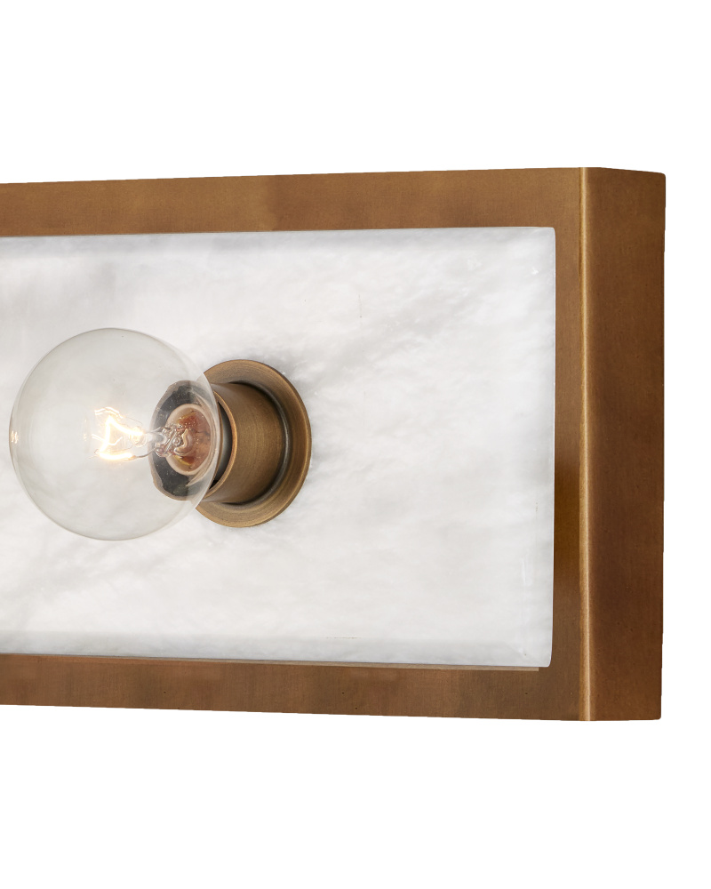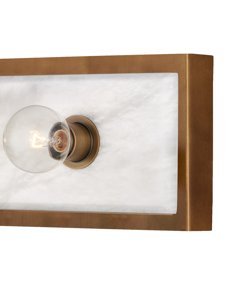 The Berdine Medium Brass Bath Bar is a simple design that allows the natural alabaster to shine. Made of metal in an antique brass finish, the warmth of the gold contrasts the coolness of the stone to bring a subtle complexity to this design. It can be mounted vertically or horizontally, and the alabaster panel has a nice bevel to it where it meets the metal rim.