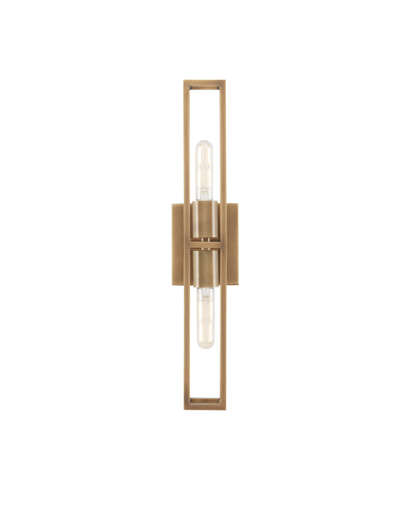 Floating within an elongated cage, the two bulbs that illuminate the Bergen Brass Wall Sconce are as lean as the overall profile of the gold sconce. Made of metal in an antique brass finish, the Bergen has a sophistication to its lines given they are pared down and perfectly formed. This wall sconce is ADA compliant and certified for damp locations. Part of the Bagno Collection of wall sconces designed for bathroom spaces.