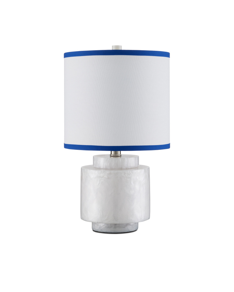 The Beryl White Table Lamp has a luminous geometric body made of composite with a swirling white pattern throughout its composition. The shape is reminiscent of a 1940s design, which brings it a vintage feel, as does the shade trimmed in a matching green.
