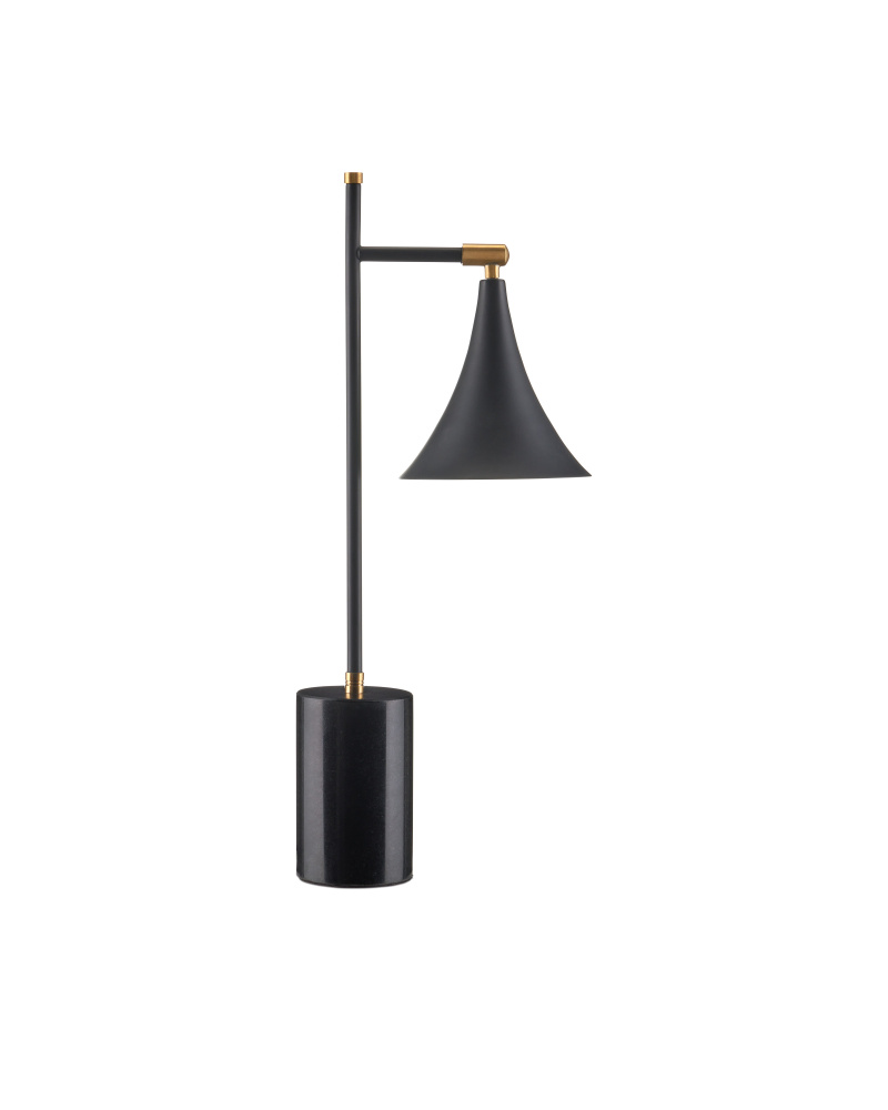 The Bibliophile Table Lamp earns its name with its elegant fluted shade that will cast down-light on the task being undertaken. The thin stem, which rises from a tall cylindrical black marble base, and the shade are in a matte black finish with sophisticated matte brass accents. Though this is a perfect helpmate for a desk, the black table lamp is not adjustable.