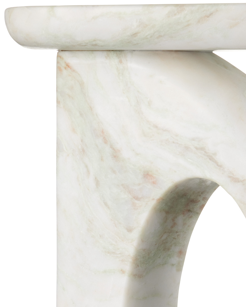 The Bilbao Aravali Onyx Accent Table has a geometric profile made from Aravali Onyx. The oculus cut-out brings its thick pedestal a sense of drama, and the body angles up on just one side to hold the top that sits asymmetrically. The white table is 16 inches tall. Because the Bilbao is made of a natural material, the veining in pale shades of pink and green will vary from piece to piece.