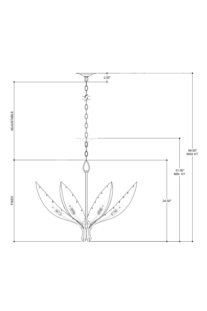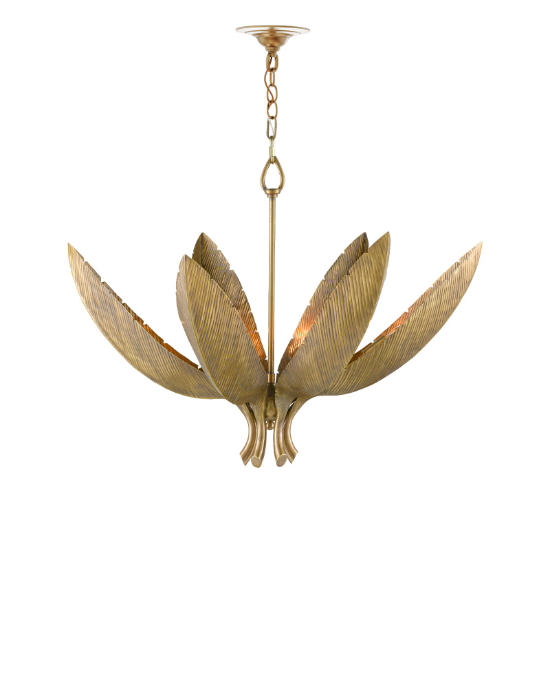 The Bird of Paradise Chandelier is another nature-inspired fixture based on the abaca leaf, which is cast in aluminum in an antique brass finish. The gold chandelier has six candelabra sockets and is suspended with a chain that connects to a thin central stem through a tear-drop-shaped element. The way the leaves and stems curve around the fixture where they are mounted makes this one of our most graceful contemporary chandeliers. Adjustable from 31" to 99" with use of included chain/rod kit/cable. If your space calls for a longer drop, additional chain/rods/cable is available for purchase.
