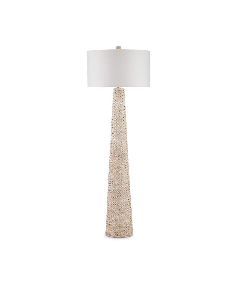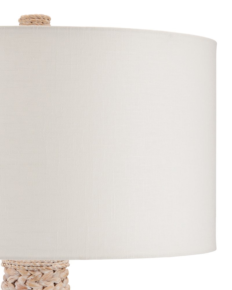 The knobby weave of water hyacinth that covers the Birdsong Whitewash Floor Lamp takes an artisan a remarkable length of time to achieve to create such visual consistency. The rope floor lamp is statuesque in scale and is a cohesive composition with its finial that matches its body. An off-white linen drum shade adds to the incredible texture this woven white floor lamp exudes.
