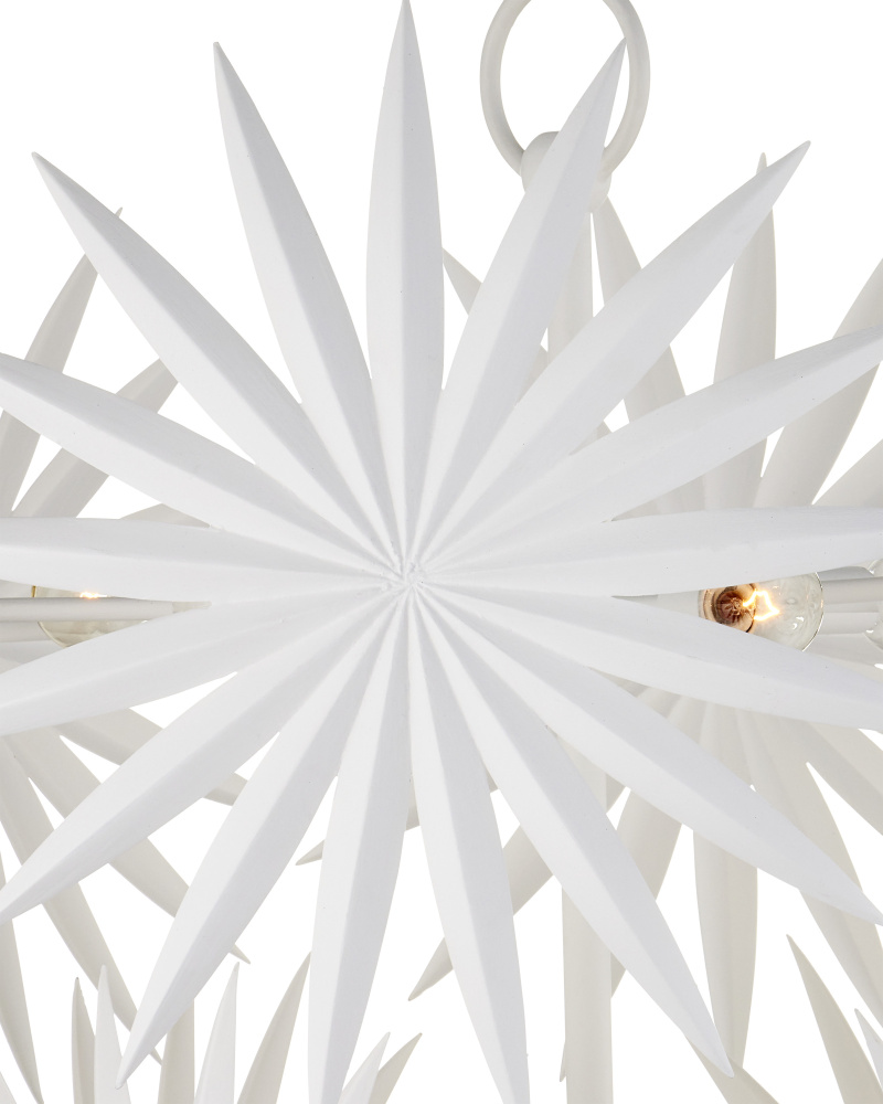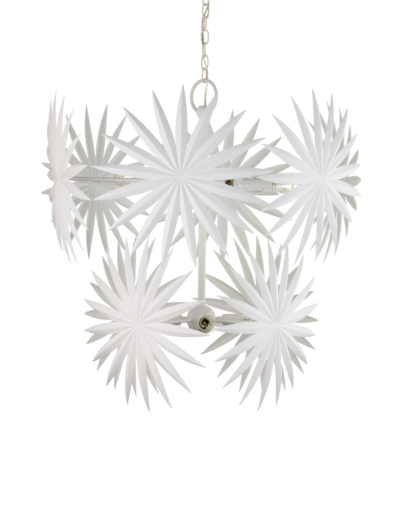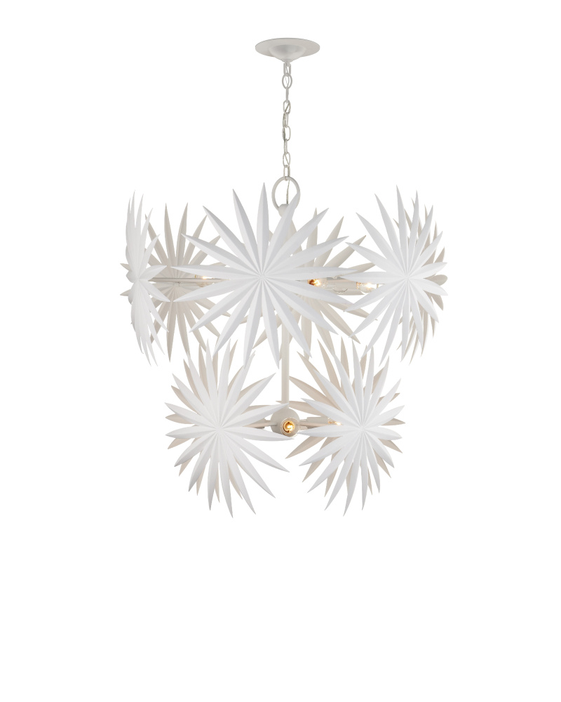 The Bismarkia Medium Chandelier was inspired by the noble Bismarkia palm, with its oversized fronds. Marjorie Skouras, who designed the chandelier, has stayed true to her love of nature for this creation. Her passion for the Yucatan, the surroundings in which she lives and through which she translates the flora and fauna into dynamic products in her studio, shines in this steel fixture covered in gesso white. The spiky ornamentations that splay around the bulbs bring immediate texture to the white chandelier. Adjustable from 39" to 107" with use of included chain/rod kit/cable. If your space calls for a longer drop, additional chain/rods/cable is available for purchase.