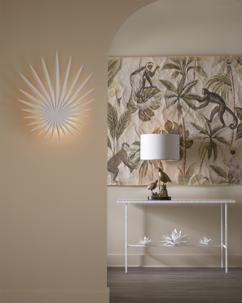 The Bismarkia White Wall Sconce was inspired by the noble Bismarkia palm, whose fronds are remarkably large. Marjorie Skouras, who designed the white sconce, has stayed true to her love of nature for this creation. Her passion for the Yucatan, the surroundings in which she lives and through which she translates the flora and fauna into dynamic products in her studio, shines in this steel fixture covered in a crisp gesso white finish. The spiky leaf sconce is lit by integrated LED technology.