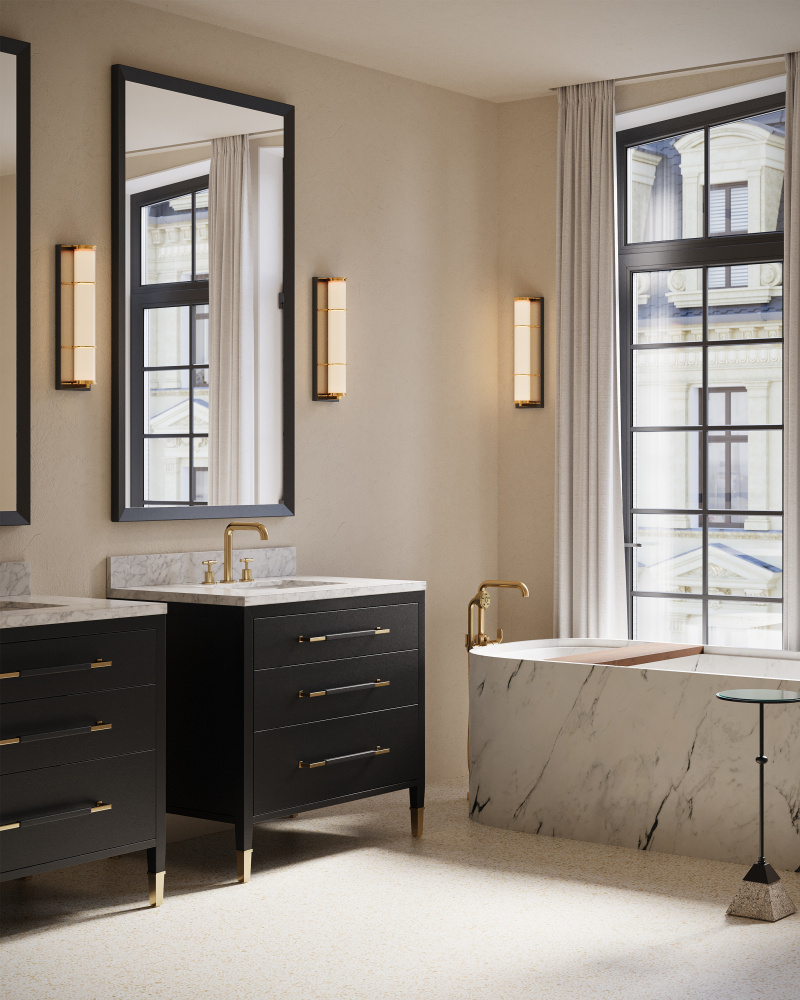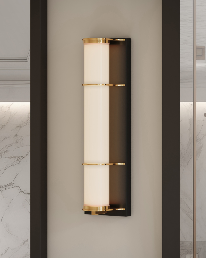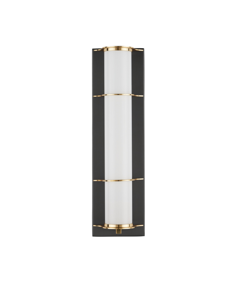 The Blaine Bronze Bath Wall Sconce has a tubular design, with a milky glass tube set into the metal rings in a polished brass finish that contrast the wallplate in an oil-rubbed bronze finish. Perfect for lighting up a bathroom vanity, the Blaine has a simple design that will work well within a number of design styles.