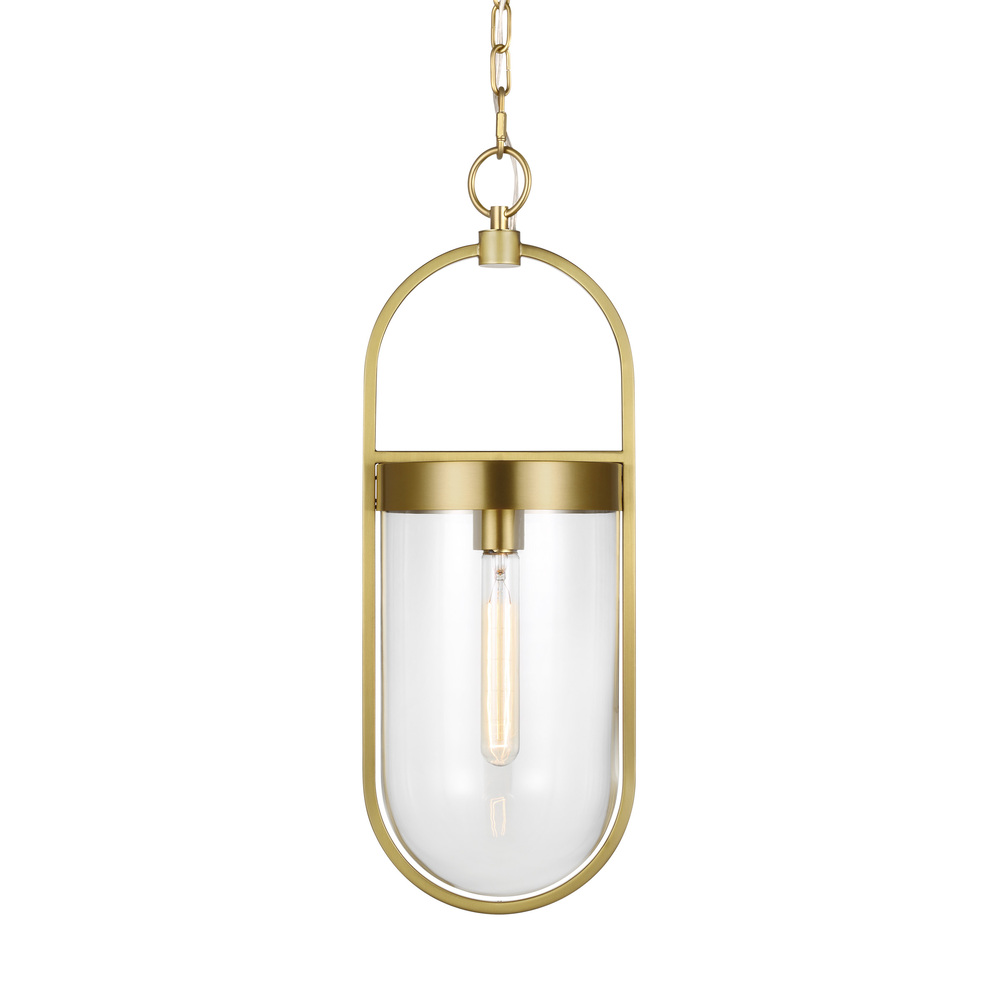 The Blaine one light indoor pendant in burnished brass Chapman & Myers is a simple modern interpretation of a classic glass smoke bell lantern. Each pendant is suspended from a unique oval frame which is circumscribed around an inner glass shade. The glass is held in place by a banded metal collar at the top and lit from within with a single filament bulb.