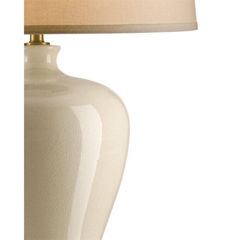 The Blaise Table Lamp has a slim, slightly fluted detail at the bottom of its traditional ginger-jar shape. Made of porcelain in a cream crackle finish, the ivory lamp is fitted with an off-white linen shade that directs light to its surface to create a serene glow.