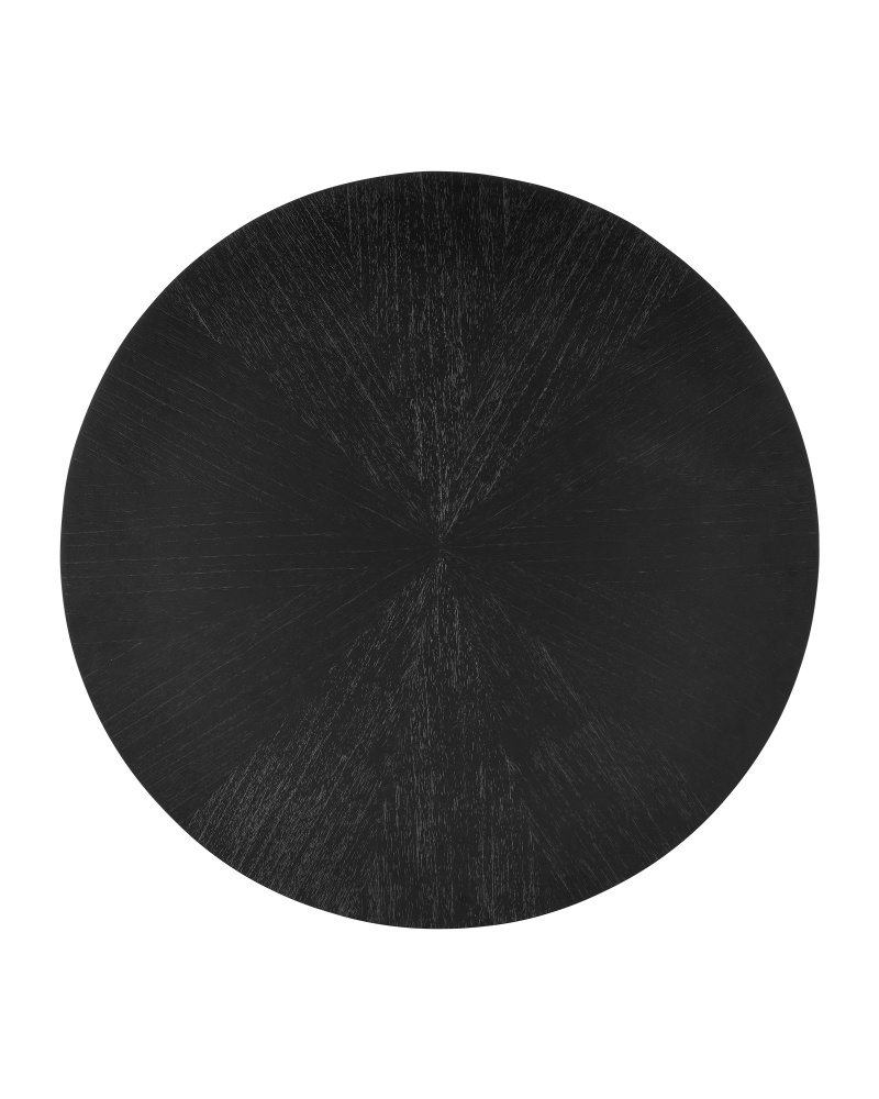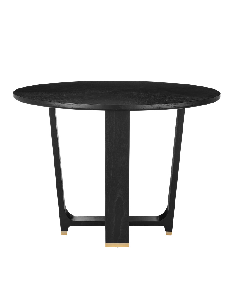 The Blake Black Dining Table is made of Mindi wood in a matte caviar black finish. The legs that curve up from the bottom hold a round top that has a subtle starburst pattern on the Mindi wood veneer. The feet are capped with polished brass ferrules. Because of its sleek lines, the table is stylistically contemporary.