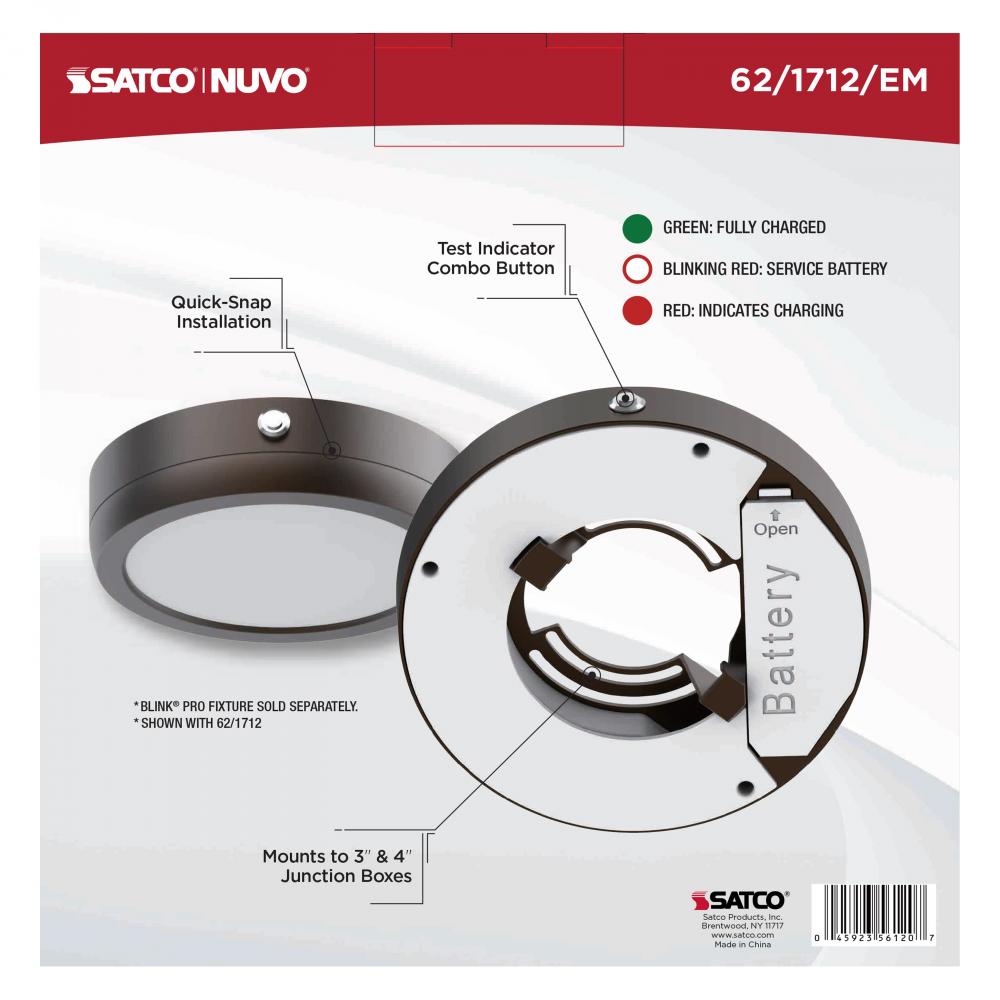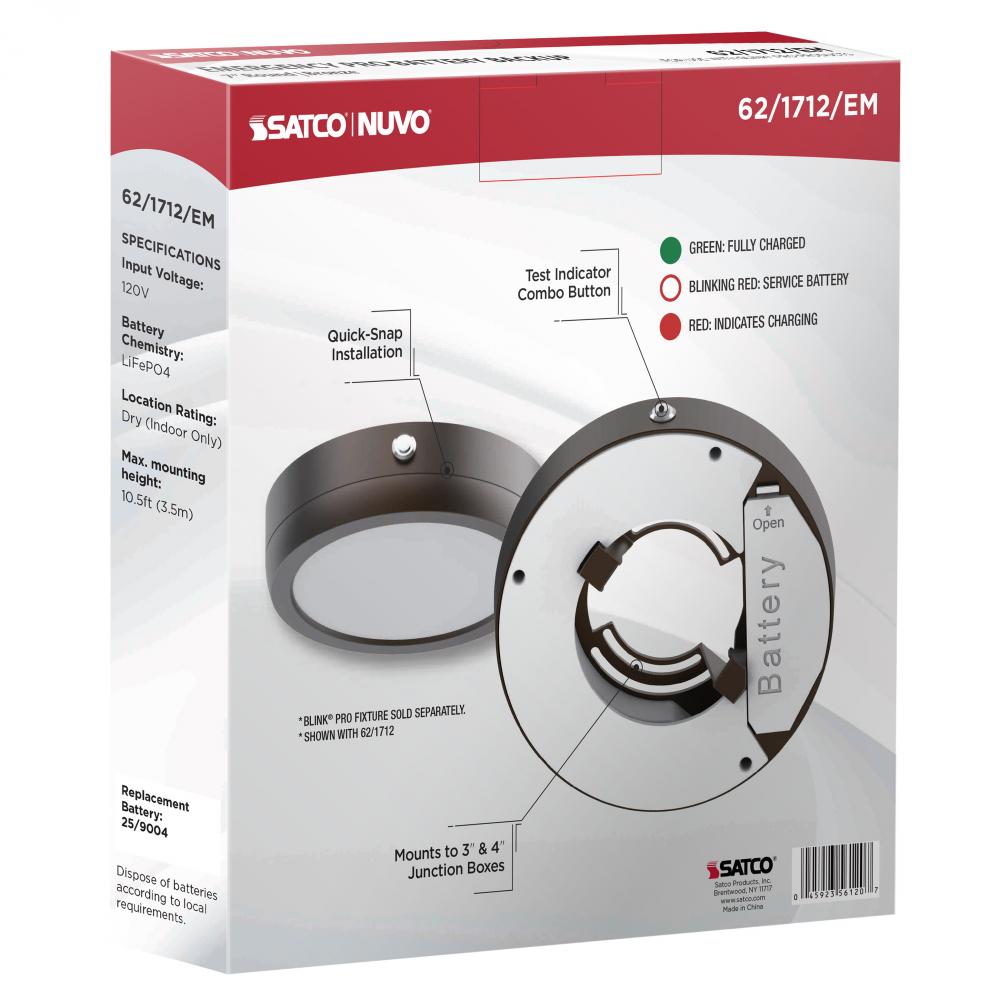 Piece of mind and safety are at the forefront of the Blink Pro 62-1712-EM emergency battery backup. It features quick-snap installation, and mounts to 3 and 4 inch junction boxes, making it a breeze to install. Compatible for use with 120V Blink Pro 62-1712.