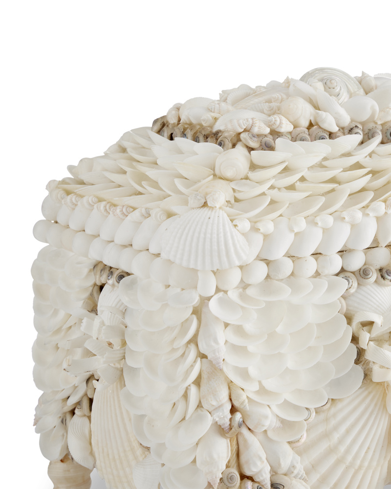 The exquisite artistry of the Boardwalk White Shell Jewelry Box has its origins in Victorian Shell Work. The handmade decorative accent is regally balanced on conical shell legs to enhance the delicate beauty of this decorative box. Though it is artful, it will also be a handy storage helpmate.