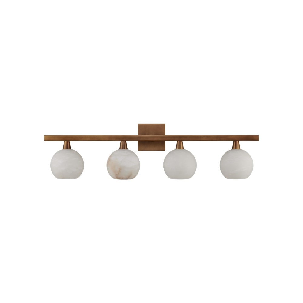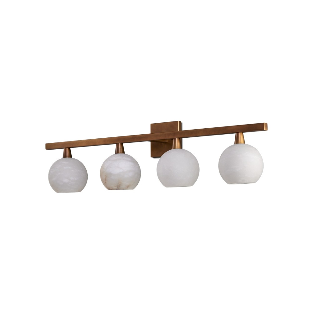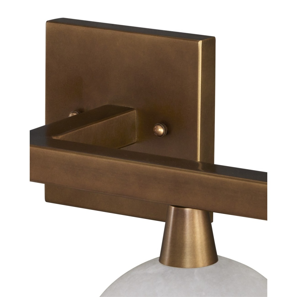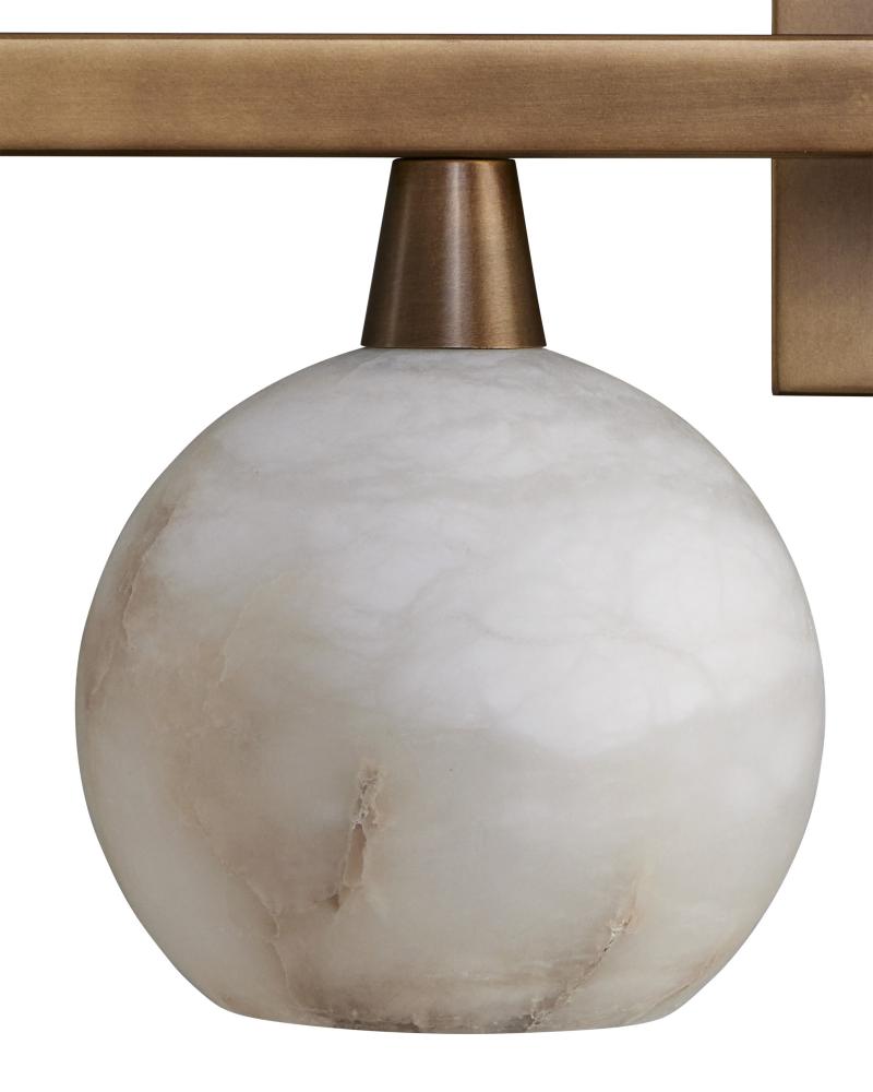 The Bombelles Brass Bath Bar was designed to spread abundant light over a bathroom counter; the fixture joining others in the Bath Collection. The globes will be luminous when they are lit, as they are made of natural alabaster, and the antique brass finish on the metal adds warmth to the design. Alabaster is a natural material, so there will be slight variations in each of the fixtures.