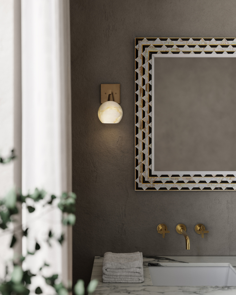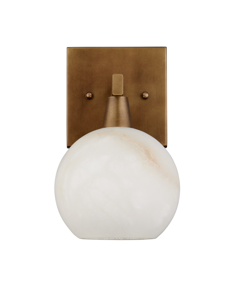The Bombelles Brass Bath Wall Sconce was designed to spread abundant light over a bathroom counter, the gold sconce joining others in the Bath Collection. The globe will be luminous when it is lit, as it is made of natural alabaster, and the antique brass finish on the metal adds warmth to the design. Alabaster is a natural material, so there will be slight variations in each of the fixtures. The Bombelles can be mounted with the globe pointing up or down.