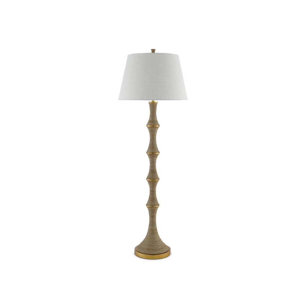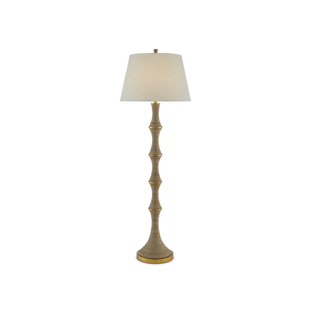An intermingling of materials brings the Bourgeon Floor Lamp its sophistication. Wrapped in Abaca rope, the matte sections along the stem are divided by metal circlets in a dark contemporary gold leaf finish that gleam when light strikes them. We've topped this tan floor lamp with a beige poplin cotton shade.