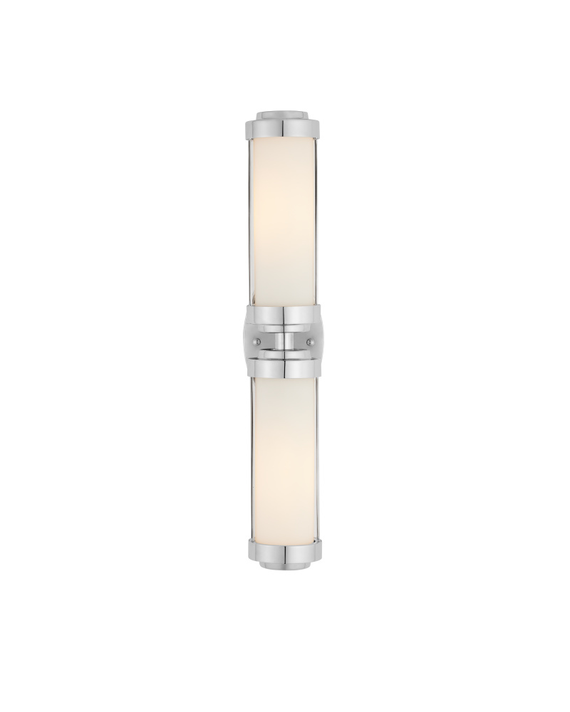 The Bowland Nickel Bath Wall Sconce features a contemporized hourglass shape designed with a fresh, modern feel. Inspired by an antique fixture, the time-honored profile is updated with sleek caps surrounding the opaque glass tubes at the top and bottom. The articulate center transition between the two elements further enhances this modernization. The metal on this fixture is in a polished nickel finish.