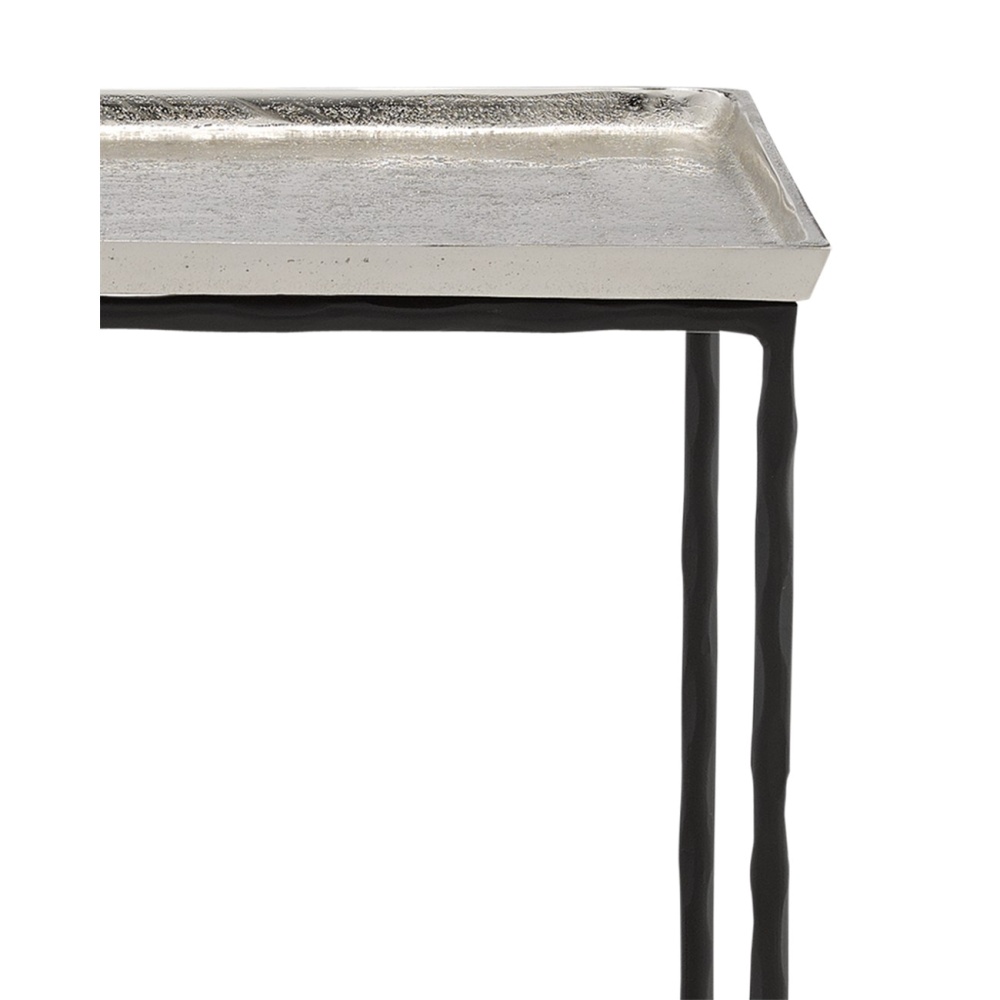 The Boyles Silver Side Table has a simple forged iron base in a black iron finish holding an antique silver tray-like top. This side table is an expressive piece of furniture for any spot where an accent table is needed.