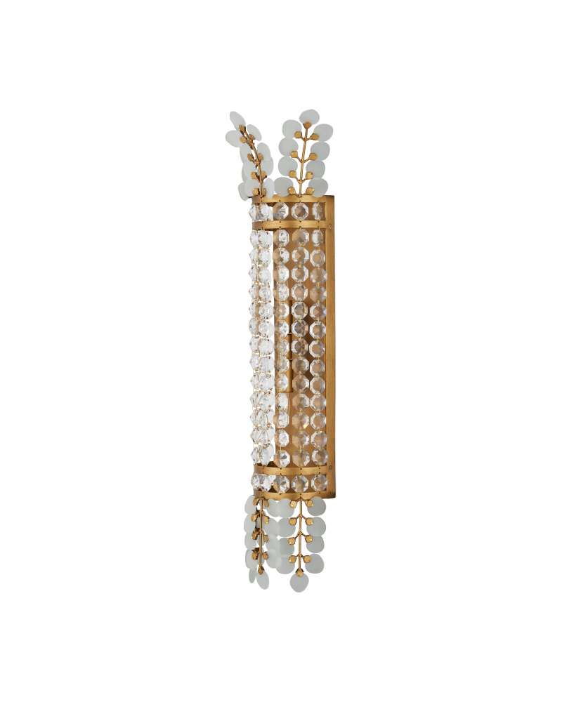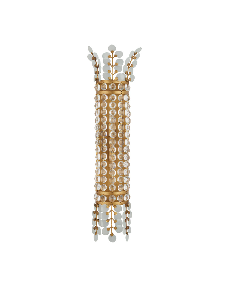 The Bradshaw Wall Sconce is made of wrought iron in a warm brass finish. Designed by Bunny Williams, the gold sconce has columnar shape fitted with sparkling crystal baguettes in the middle and frosted glass discs that flow up and extend down to create flourishes on the top and bottom, the uppermost one curved like a small coronet. The milky glass pieces, which are made specifically for this fixture individually, have edges that are polished for a sophisticated feel. Each one and each of the crystals are attached by hand. Williams was inspired by an antique with an Art Deco feel when she envisioned this dimmable two-light wall sconce.