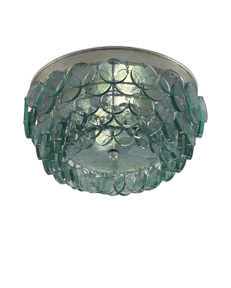 Recycled glass discs dangle from the Braithwell Flush Mount to form a textural shade. The discs vary in size and overlap on the wrought iron frame in a silver leaf finish of the to make this green glass flush-mount a mottled mosaic.