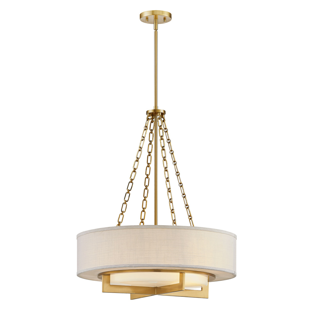 With the Savoy House Brentwood 4-light pendant, you can bring a crisp and classic silhouette to any space! Get bright, comfortable lighting from the drum-shaped white linen shade and discover an added dimension of illumination from the glass shade beneath it, held in place by jewelry-like prongs finished in Warm Brass. Brentwood is 24" in diameter and has an adjustable height that ranges from 30" to 84". It uses four standard size bulbs of up to 60 watts per bulb. Bulbs not included. Comes with four 12" downrods and one 6" downrod.