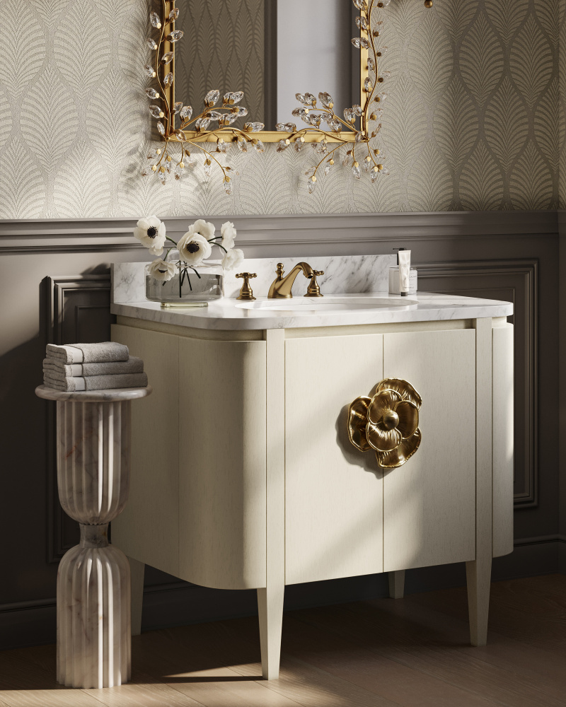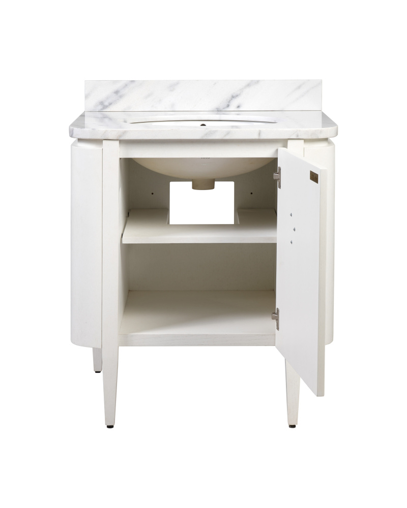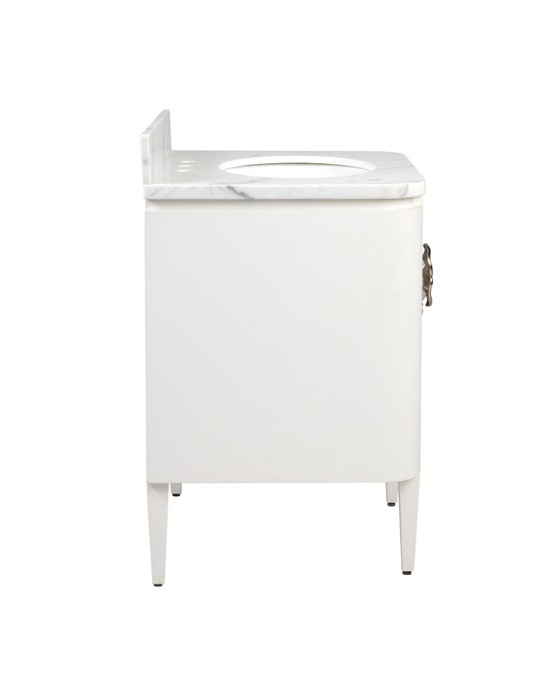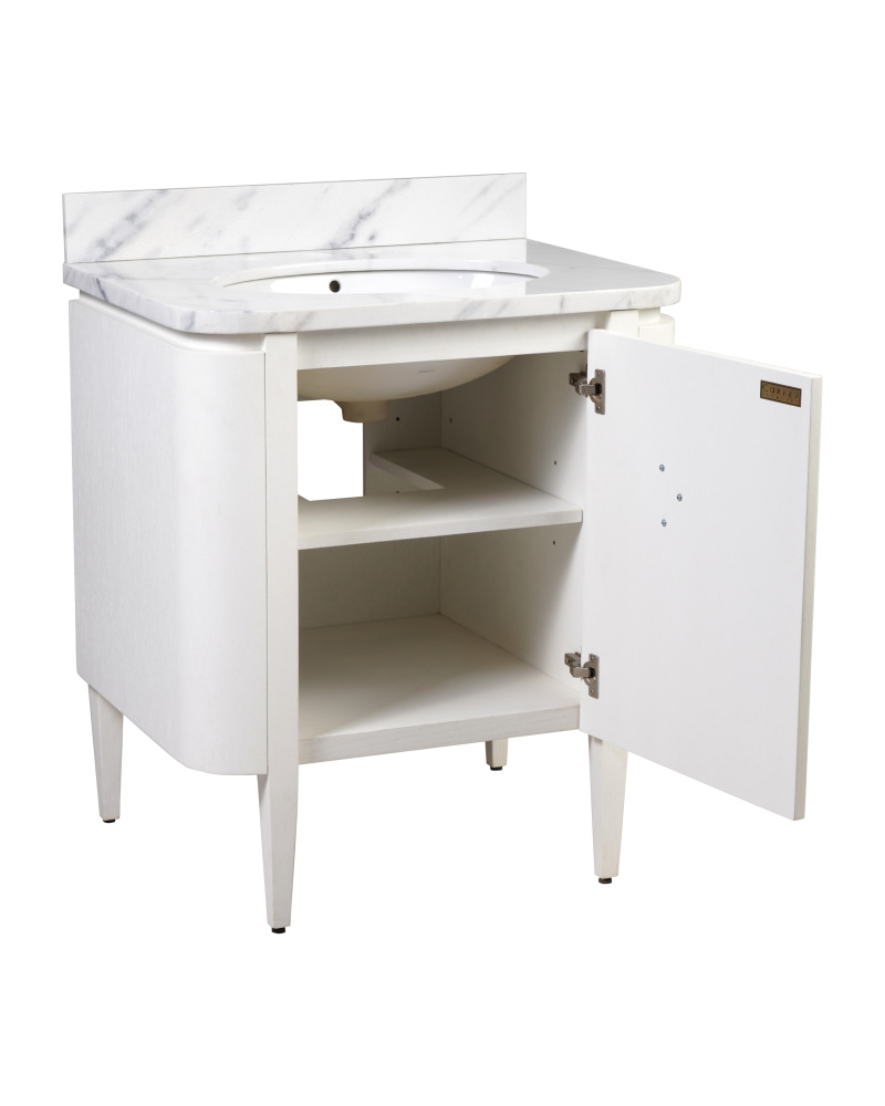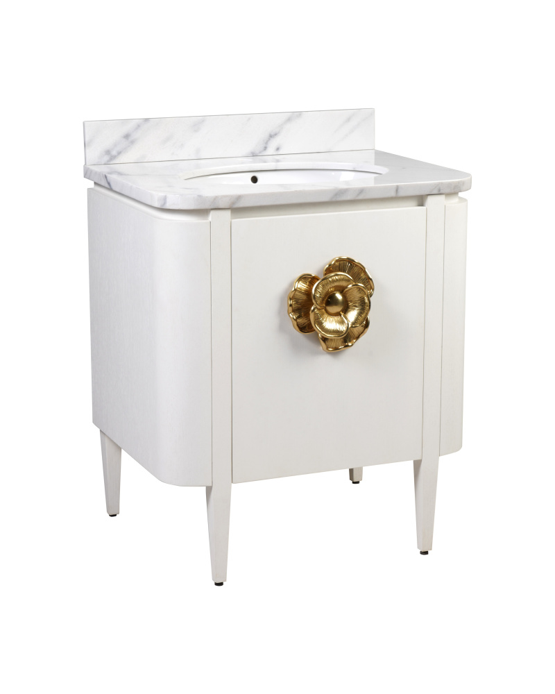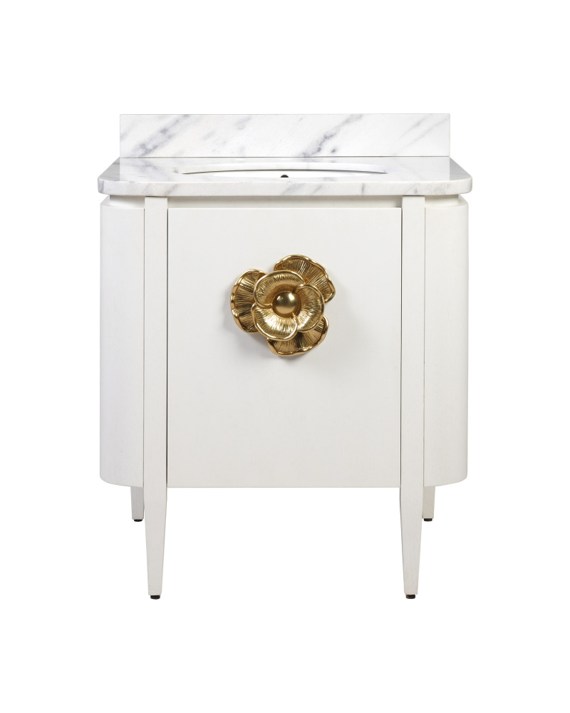 The impressively sized brass flower pull on the Briallen 30" White Vanity is a stunning ornamentation that contrasts the cerused white finish. The interior has one adjustable shelf and there is an optional wood tray that attaches to the inside of the door. The white Carrara marble top is fitted with a white oval undermount sink. Other fine design attributes include soft-close door hinges and a matching marble backsplash.