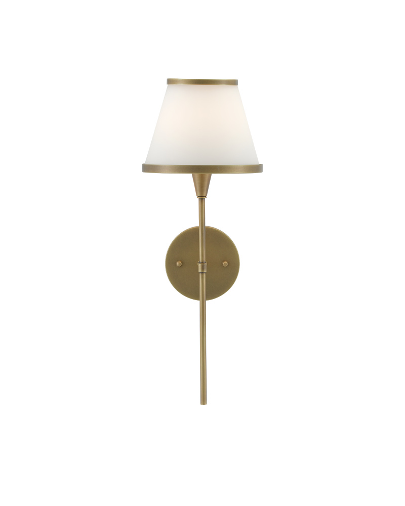 Pencil thin with a stylish trim on its opaque glass shade, the Brimsley Brass Wall Sconce is brimming with tailored sophistication. The gold wall sconce is made of metal in an antique brass finish, the warmth of the antiqued surfaces contrasting the crisp white glass on the shade. The Brimsley is also available in polished nickel and oil-rubbed bronze finishes, all three sconces certified for damp locations. Part of the Bagno Collection of wall sconces designed for bathroom spaces.