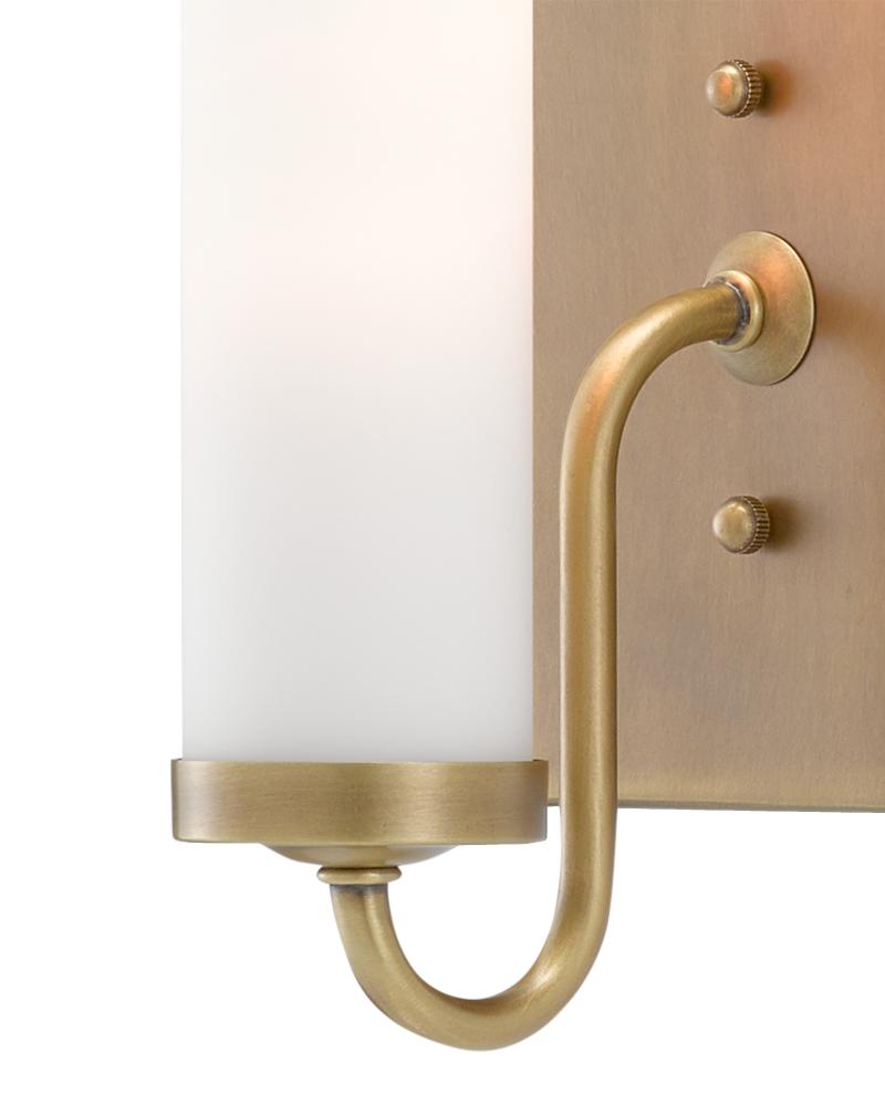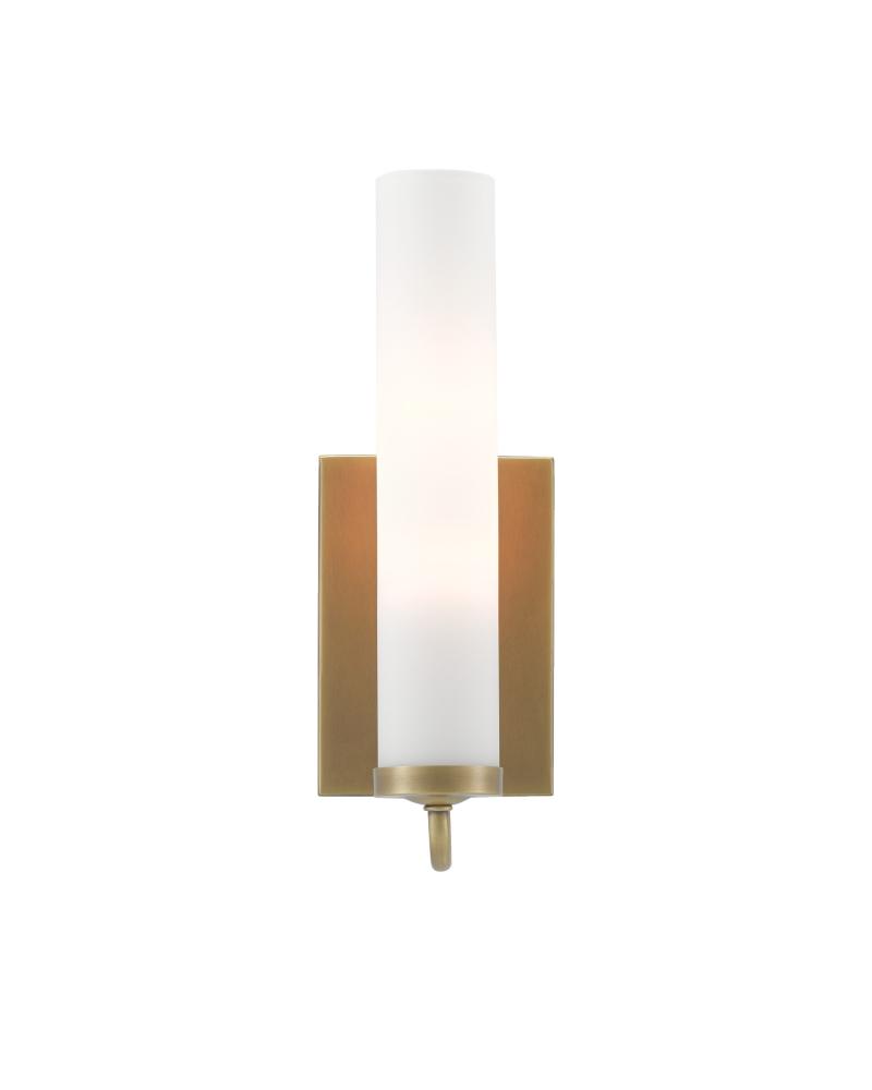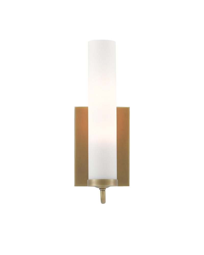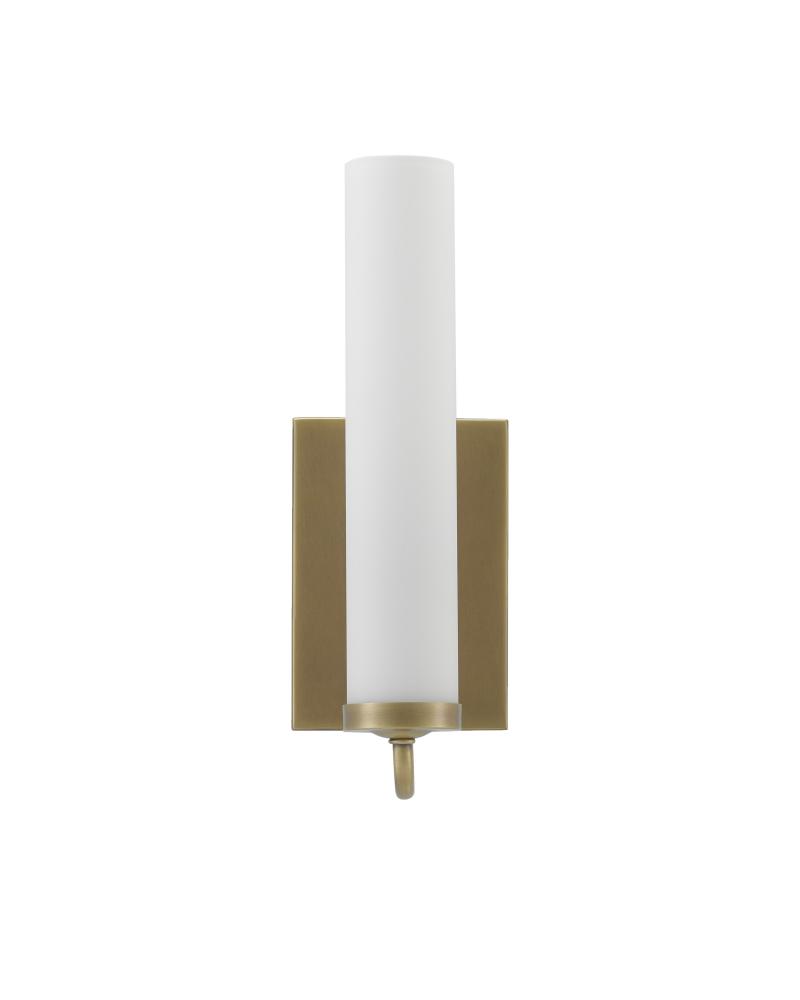 The arcing arm of the Brindisi Brass Wall Sconce defines the gracefulness of this design, the disc-shaped bobeche atop the tubular support serving as the perch for the tall, thin opaque glass canister shade. Made of metal in an antique brass finish, the cleanly designed gold wall sconce with its softly glowing white shade is certified for damp locations. Part of the Bagno Collection of wall sconces designed for bathroom spaces.