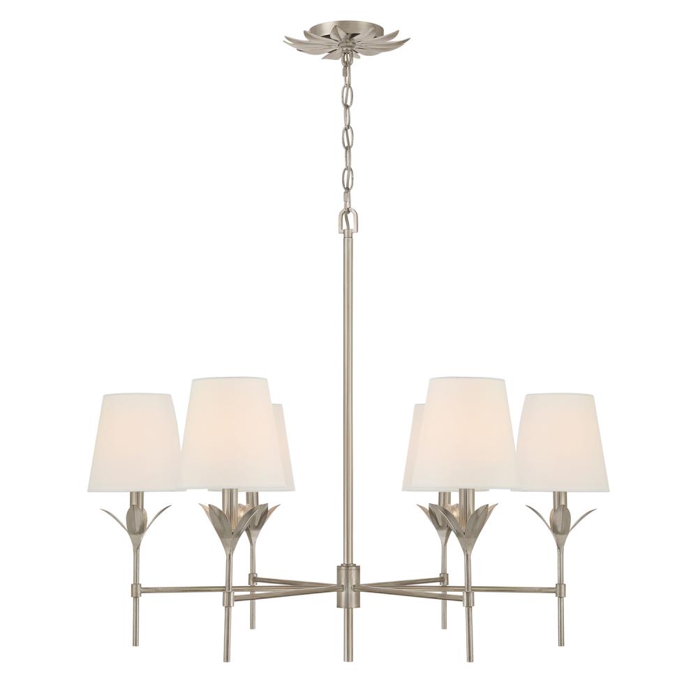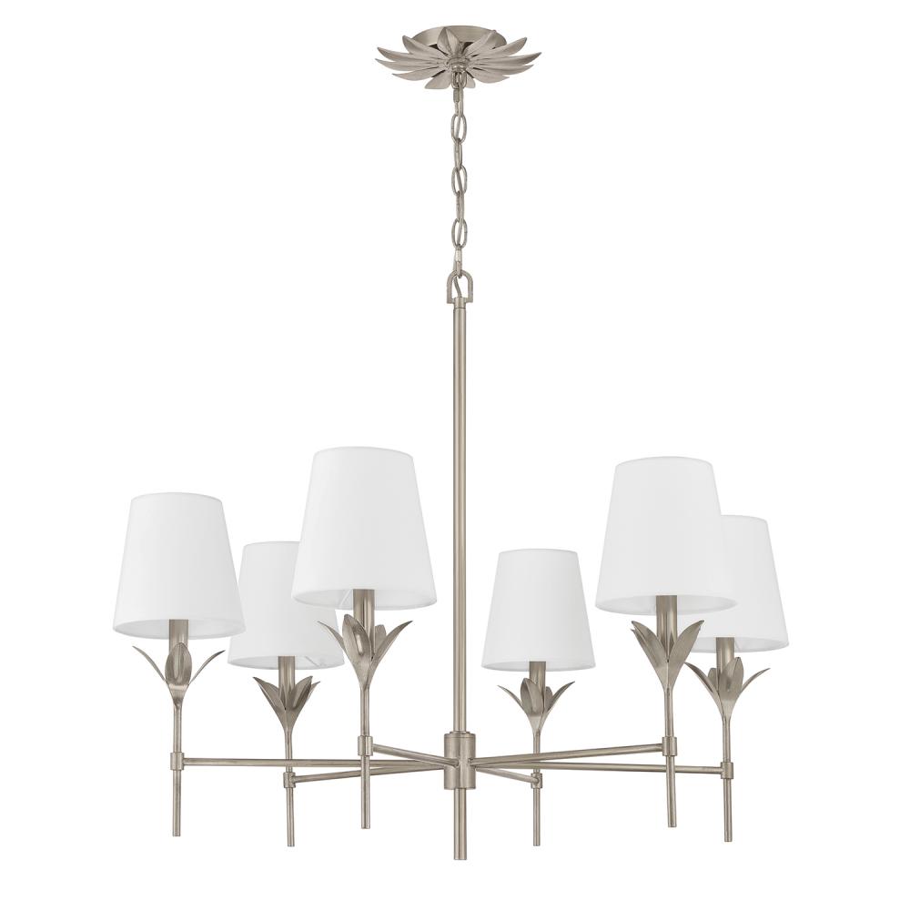 The Broche 6 Light Chandelier embodies a harmonious blend of traditional and modern elements. This fixture exudes timeless elegance with its candelabra-style frame and white linen shades. The layered wrought iron leaves create a stunning and functional display of light. Whether in a bedroom, living area, or kitchen, this chandelier adds a touch of refined glamour to any space, making it perfect for transitional and modern designs.
