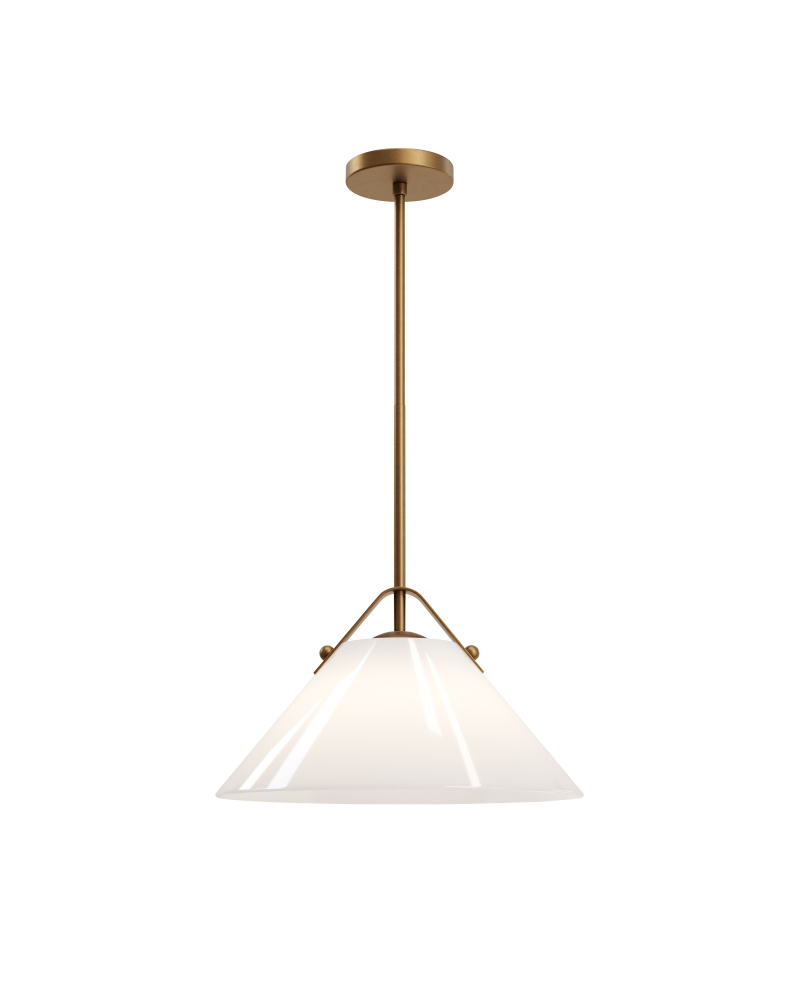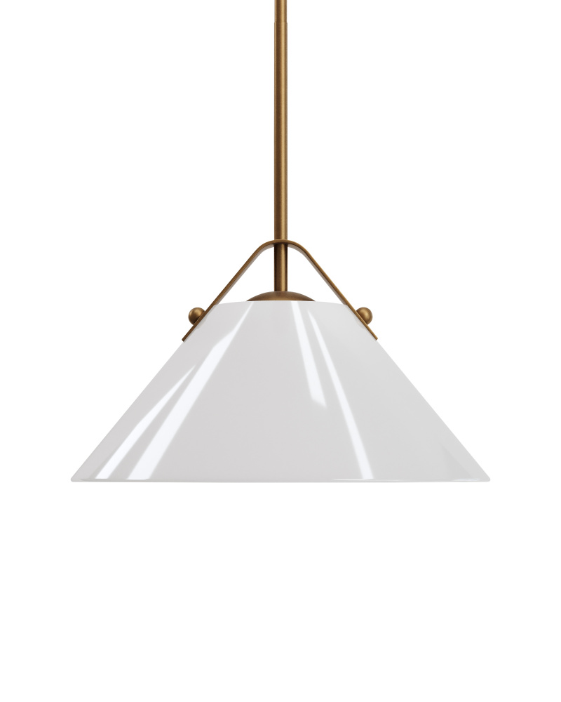 The Bronwen Brass Pendant is an equestrian-inspired design with a flaring white glass shade fastened to the round canopy with a sophisticated strap—a subtle nod to classic tack hardware. The profile can lean modern farmhouse, though it also complements other design styles. The metal in an antique brass finish is a nice contrast to the paleness of the shade, which has a glossy surface that glows. At 19 inches in diameter, the one-light pendant is dimmable. Adjustable from 18" to 60" with use of included chain/rod kit/cable. If your space calls for a longer drop, additional chain/rods/cable is available for purchase.