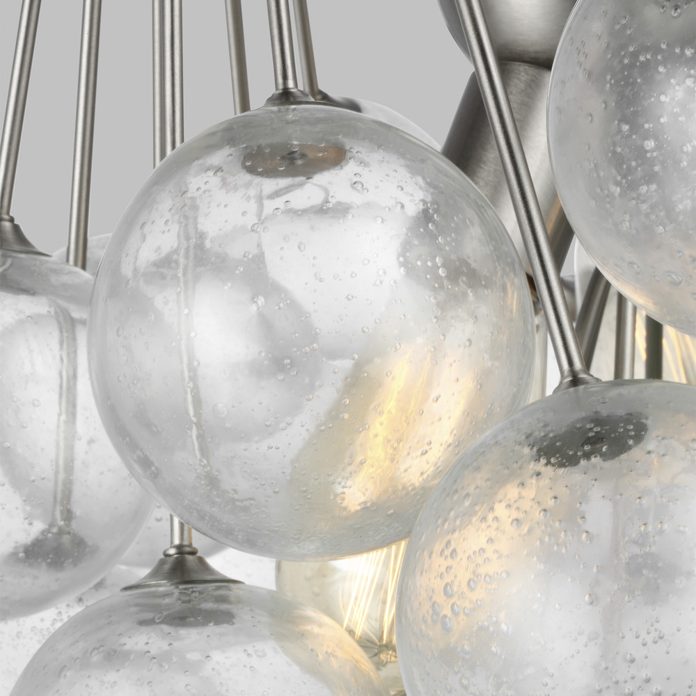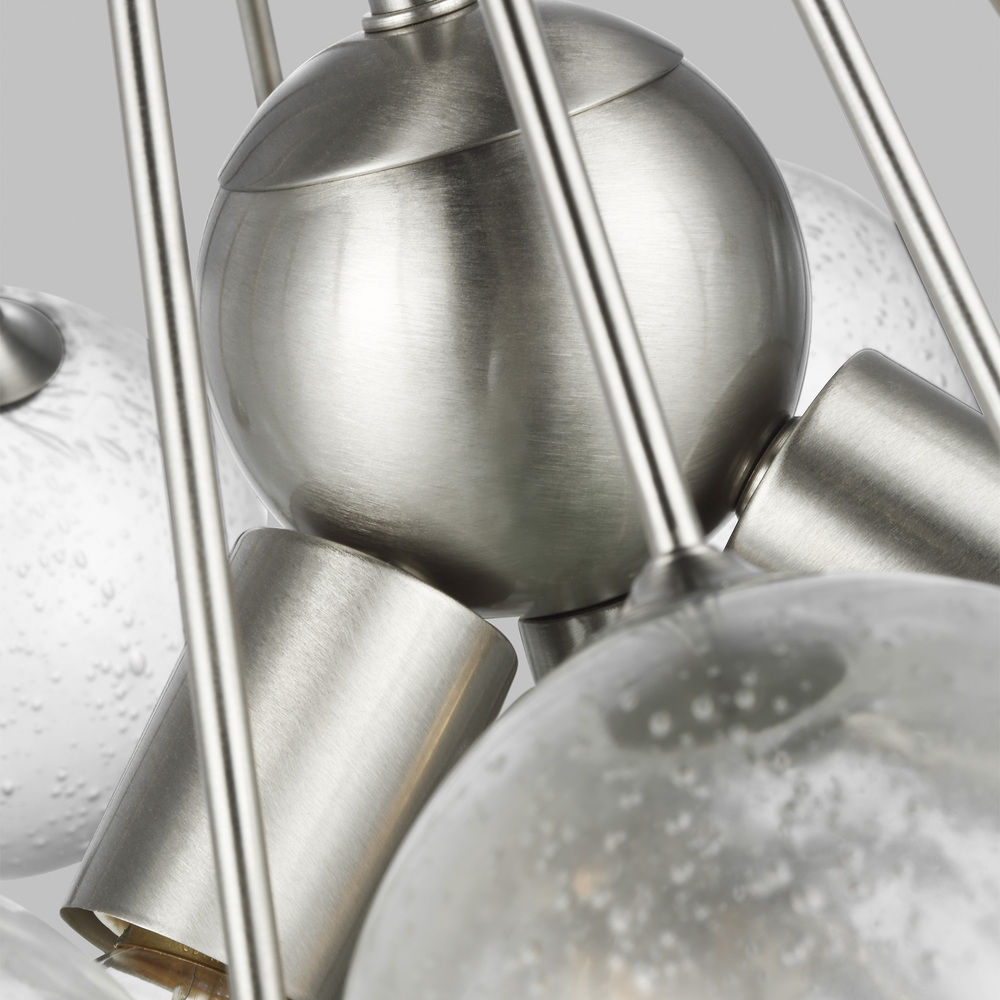 The Bronzeville three light indoor pendant in brushed nickel is the perfect way to achieve your desired fashion or functional needs in your home. Bronzeville brings a daring, upscale element of mid-century modern design to any space. Hand blown, Seeded Glass globes encircle warm, glowing, filament lamps, diffusing the light to create a serene ambiance of light and shadow. Available in two finishes.
