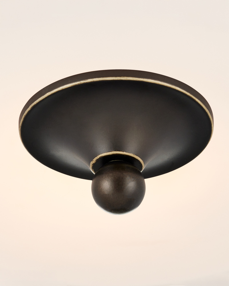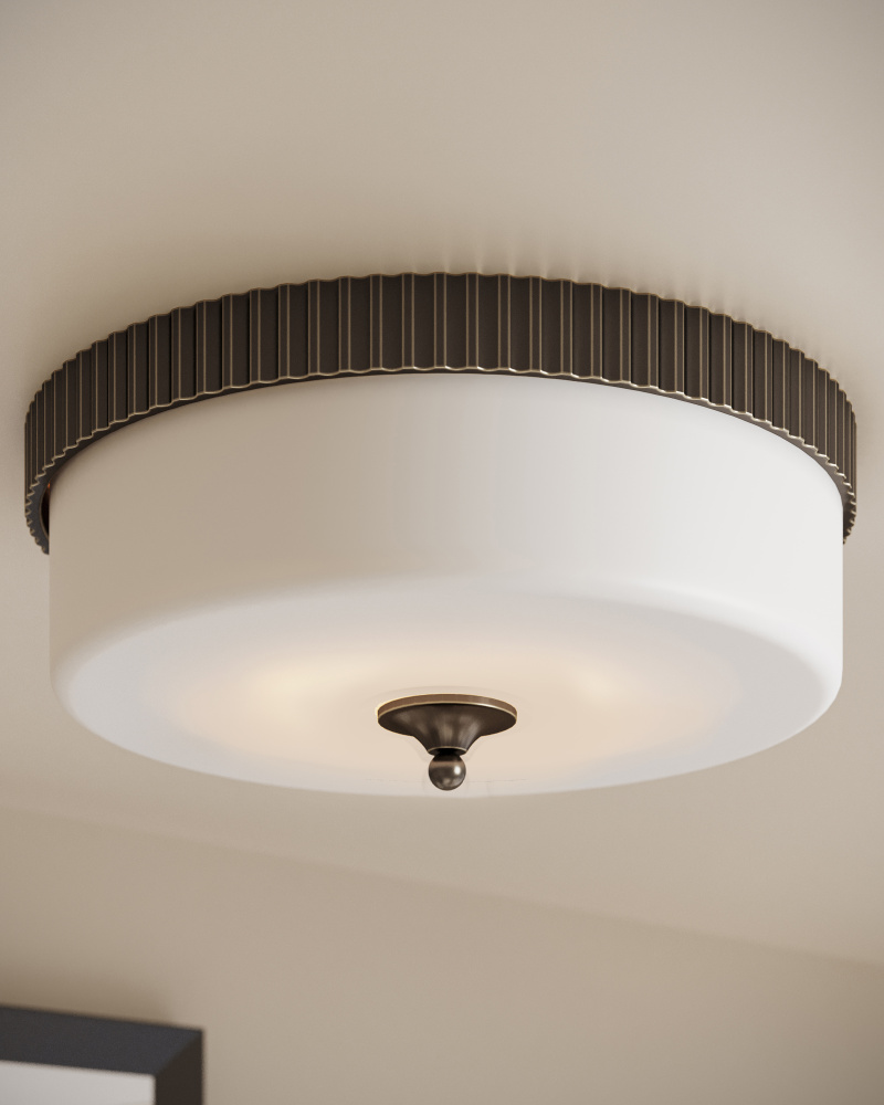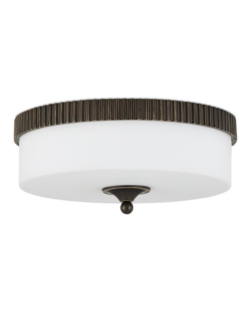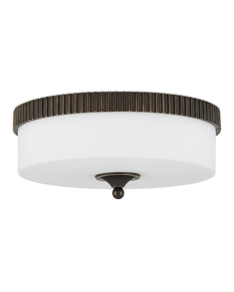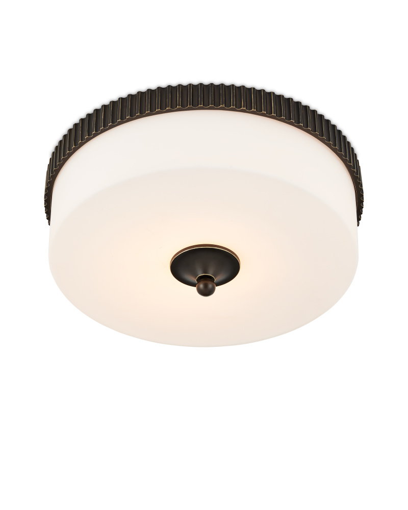 The Bryce Bronze Flush Mount is a modern fixture that is just as at home in any hall as it is in a bathroom. This simple round form is embellished with a motif that hearkens to industrial gears. Barry Goralnick is comfortable exploring these forms; the addition of the oil-rubbed bronze finish a handsome new touch. The classically inspired finial capped off with a ball adds a sophisticated focal point, and the glass diffuser in frosted glass provides an even glow. The Bryce is fitted with integrated LED technology.