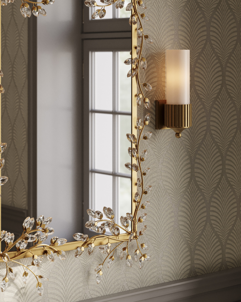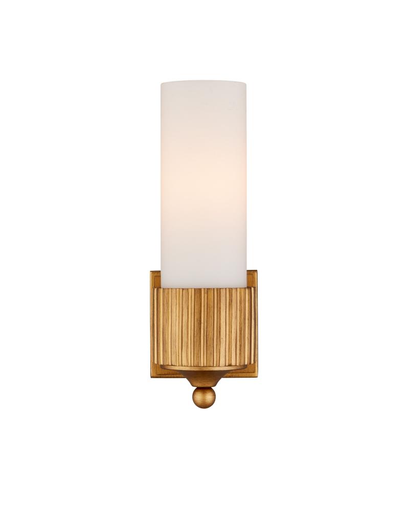The Bryce Gold Bath Wall Sconce is a clean-lined fixture that will be at home in any number of styles. This simple round form is embellished with a motif that hearkens to industrial gears. Its designer Barry Goralnick is adept at exploring these forms to which a gold finish brings a luminous touch. The classically inspired finial that ornaments the bottom of the sconce is a sophisticated focal point, and the frosted glass tube provides an even glow.