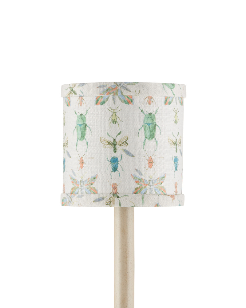 Whimsical bugs and insects lend a colorful touch to this drum-shaped chandelier shade from design partner Lacefield Designs.