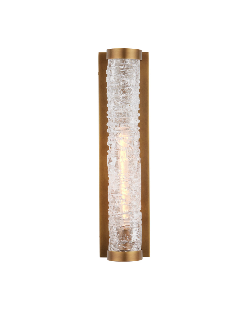 The Busby Brass Bath Wall Sconce has a metal frame in an antique brass finish fitted with a textural glass tube that is painstakingly created. To achieve the look of cracked frozen glass, molten glass is manipulated until it reaches the desired feel, which means the texture on each one of these gold sconces will be slightly different. The one-light sconce is dimmable and damp rated for bathrooms.