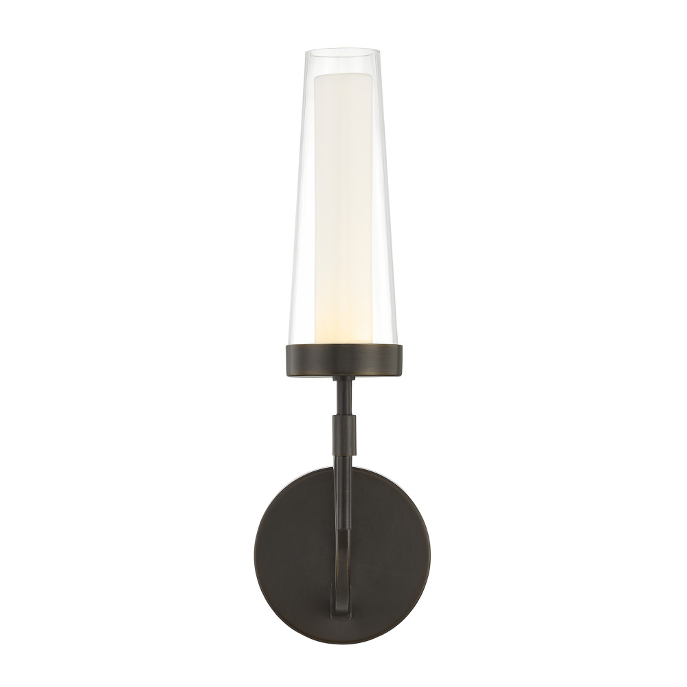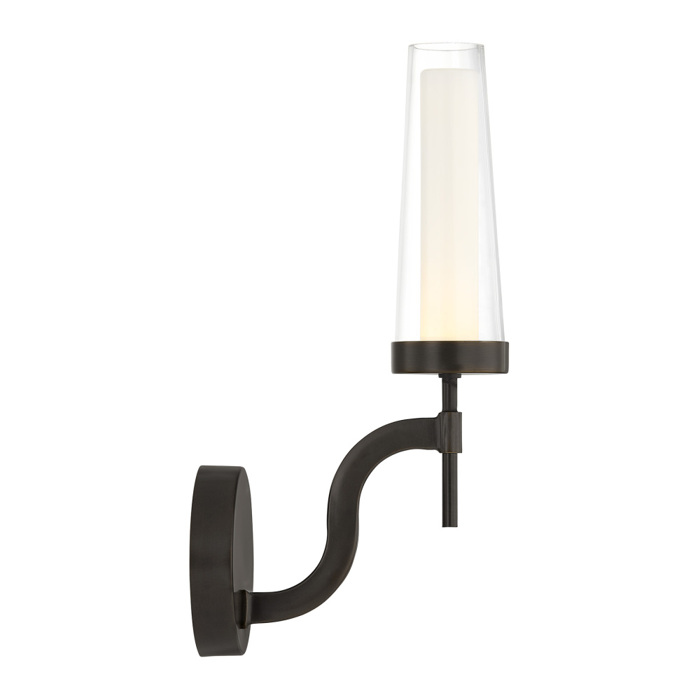 The Savoy House Butler 1-light sconce is an intriguing update to traditional lighting style. Layers of opal and clear glass create the soft, atmospheric light of a traditional taper candle, but with an updated twist. The integrated LED light source brings a bright glow while the Mediterranean Bronze finish adds gorgeous radiance. Butler is 14" in height, 4.5" in width and extends 7.5" from the wall. This sconce is damp area rated.