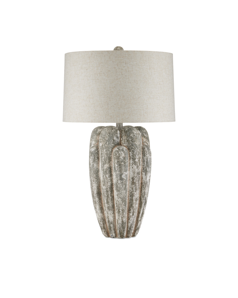 The Buttress Table Lamp is a rough luxe design made of composite in a mix of dark gray and textured white finishes to make it look like weathered concrete. The shape of the sections are reminiscent of lady fingers and the swelling of the lamp's body creates interest as it rises toward the subtly textured shade.