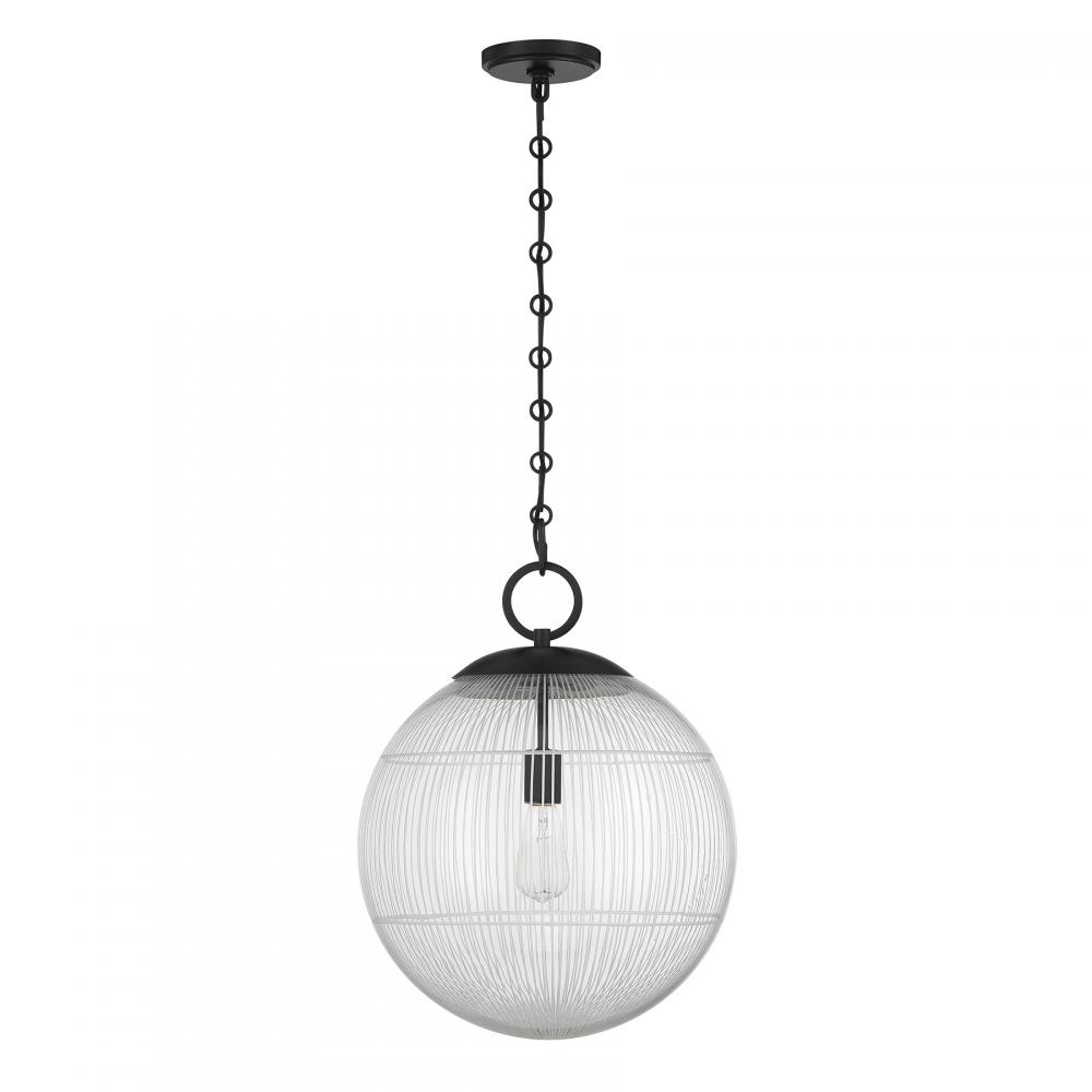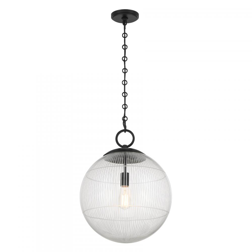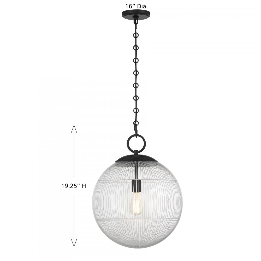 The Savoy House Cabot 1-light pendant takes the beauty of pendant lights to a whole new level with its orb of segmented glass. This orb has an intriguing slim cage-like pattern etched into it, creating a huge dose of texture and style whether the light is on or off. Circular hardware detailing echoes the shape of the glass and wears a Matte Black finish beautifully. Cabot is 19.25" in height and 16" in width. Uses one standard size bulb of up to 60 watts. Bulb not included. Comes with 120" of chain.