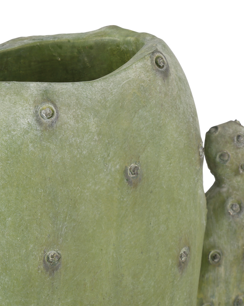 The Cactus Vase Set includes three vases are made of composite to resemble cement. The vases are slathered in varying shades of green for an aged verdigris ombré effect, and the matte glazing, achieved by a dry finish, increases the patina of each of these accessories. The artisans who created these vessels hand-applied the finish, which means they will vary slightly from vase to vase.