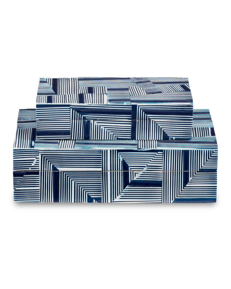 With bold patterns that match on all sides, the Cade Blue Box Set includes two nesting boxes that are made of solid wood covered in composite in blue and white patterns. The intermingling of thin and thick delineations creates a telescoping effect that brings the surfaces of these boxes the feel that they are in constant movement. The application is a painstaking one.