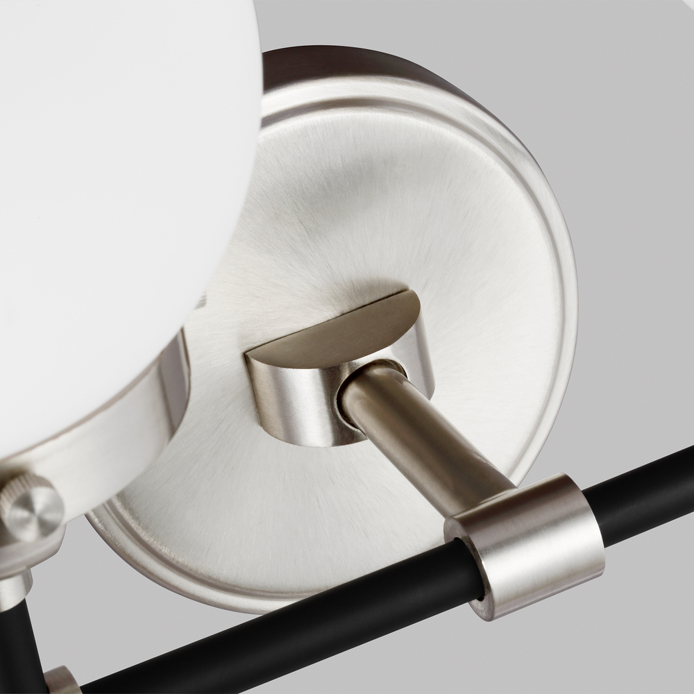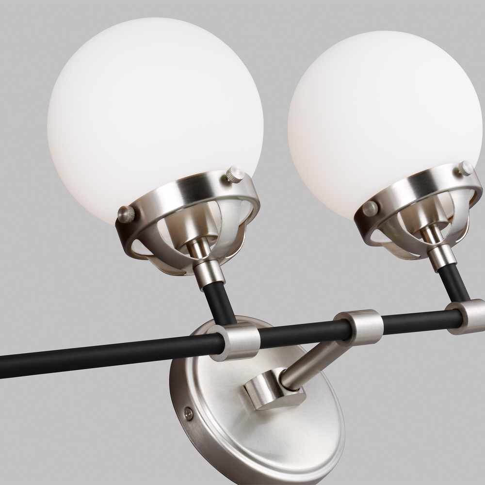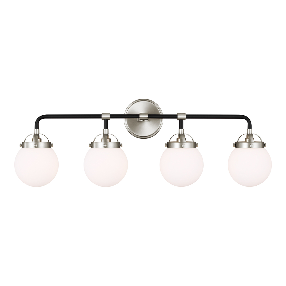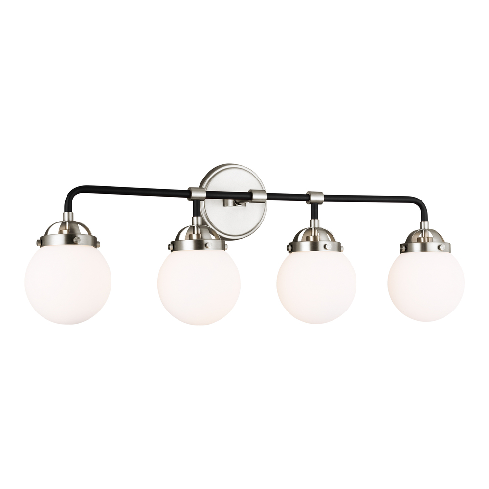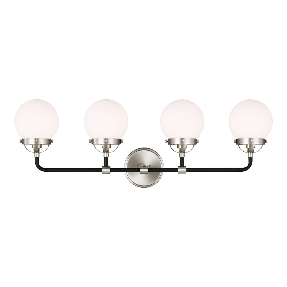 The Cafe four light vanity fixture in brushed nickel provides abundant light for your bath vanity, while adding a layer of today's style to your interior design. Â Handsome two-tone finish and white glass globe shades.