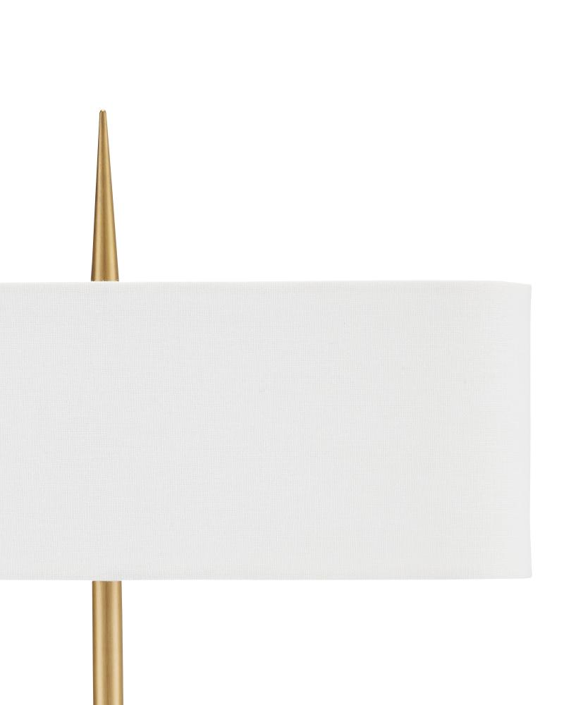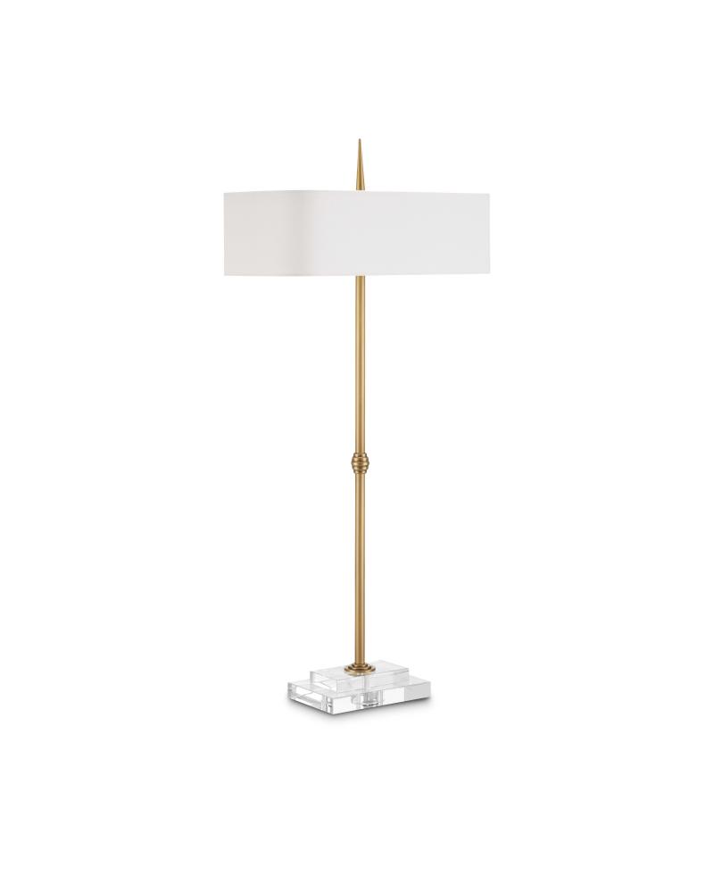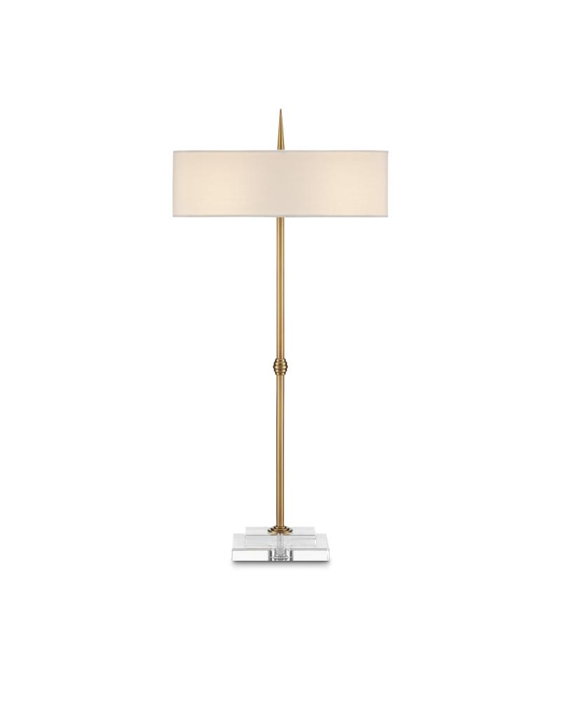 To celebrate the design prowess embodied in this piece, the Caldwell Table Lamp stands out as a classic design. The architectonic stem that composes the slim profile features a bee-hive ornament at its midpoint and culminates at the optic crystal base in three concentric rings that grow as they meet the stacked material. The pointed finial is a clever touch, as it looks as if the stem pierced the shade uninterrupted. Finishing the metal with an antique brass finish brings the gold table lamp warmth, as does the bone linen shade with its suave narrow profile.